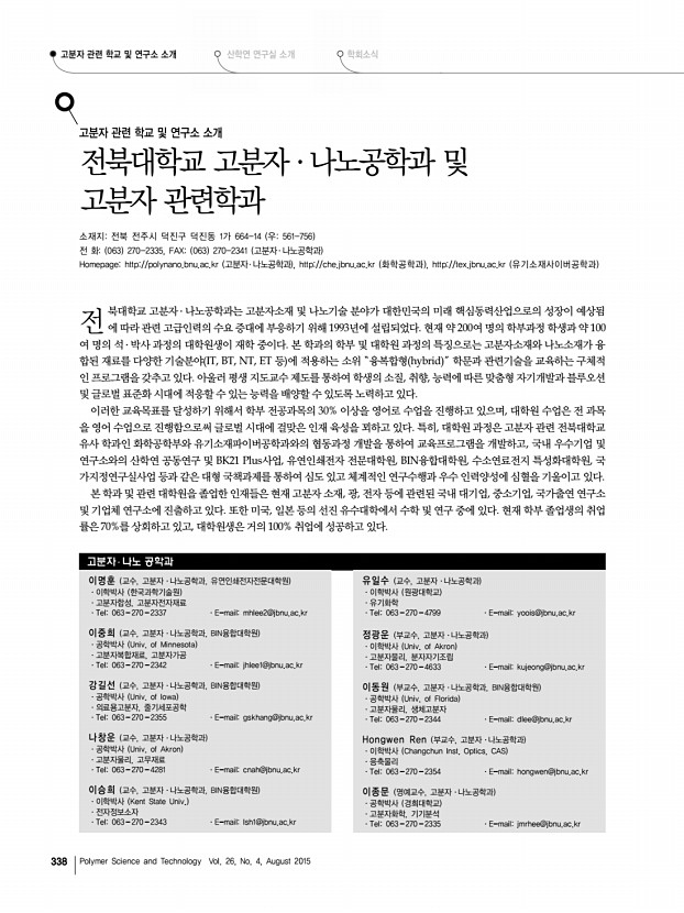 ...분자 소재, 광, 전자 등에 관련된 국내 대기업, 중소기업, 국가출연 연구소 및 기업체 연구소에 진출하고 있다. 또한 미국, 일본 등의 선진 유수대학에서 수학 및 연구 중에 있다. 현재 학부 졸업생의 취업 률은 70%를 상회하고 있고, 대학원생은 거의 100% 취업에 성공하고 있다. 고분자 ․ 나노 공학과 이명훈 교수, 고분자 ․ 나노공학과, 유연인쇄전자전문대학원 ·이학박사 한국과학기술원 ·고분자합성, 고분자전자재료 ·Tel063-270-2337 ·E-mailmhlee2@jbnu.ac.kr 이중희 교수, 고분자 ․ 나노공학과, BIN융합대학원 ·공학박사 Univ. of Minnesota ·고분자복합재료, 고분자가공 ·Tel063-270-2342 ·E-mailjhlee1@jbnu.ac.kr 강길선 교수, 고분자 ․ 나노공학과, BIN융합대학원 ·공학박사 Univ. of Iowa ·의료용고분자, 줄기세포공학 ·Tel063-270-2355 ·E-mailgskhang@jbnu.ac.kr 나창운 교수, ...