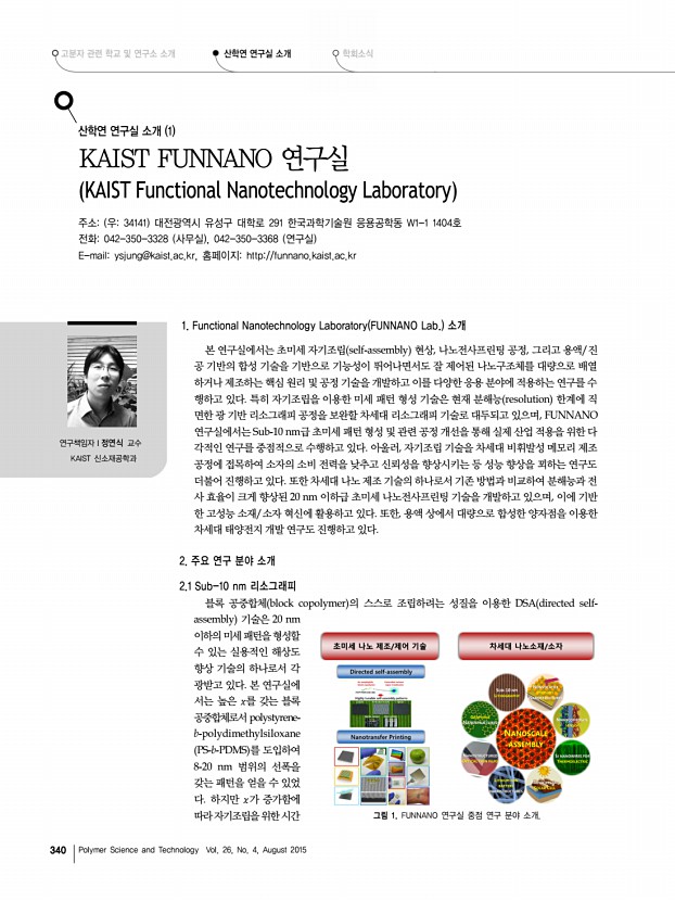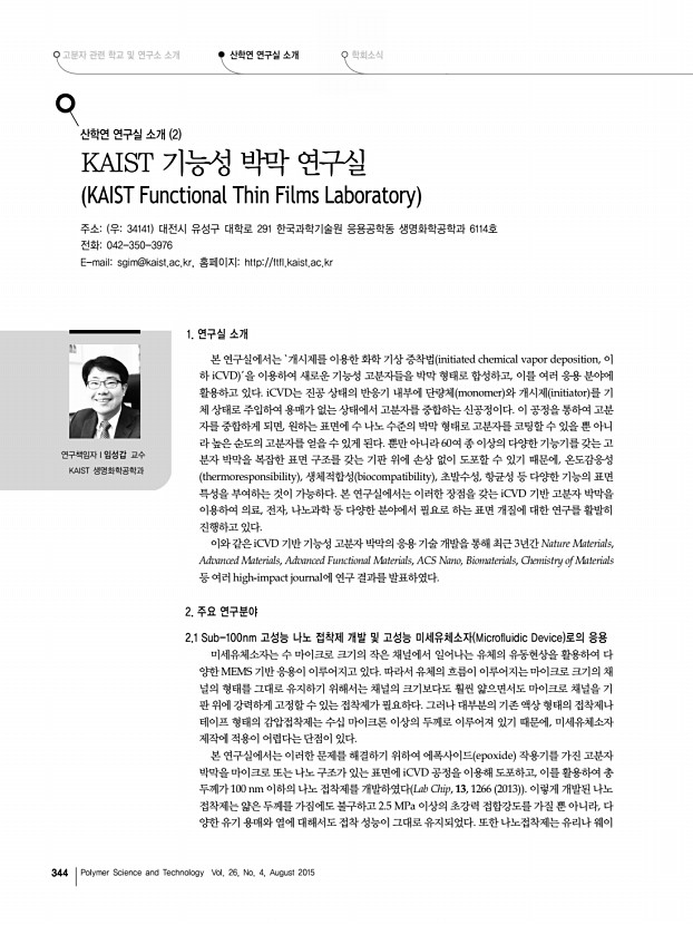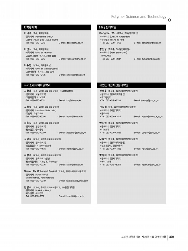 고분자 과학과 기술 제 26 권 4 호 2015년 8월 339 화학공학과 BIN융합대학원 이대수 교수, 화학공학부 ·공학박사 Polytechnic Univ. ·고분자 구조와 물성, 가공과 유변학 ·Tel063-270-2310 ·E-maildslee@jbnu.ac.kr 이연식 교수, 화학공학부 ·이학박사 Univ. of Arizona ·공업유기화학, 유기전자재료 합성 ·Tel063-270-2312 ·E-mailyosklear@jbnu.ac.kr 이수형 부교수, 화학공학부 ·이학박사 Univ. of Massachusetts ·고분자화학, 유기전자재료 소자 ·Tel063-270-2435 ·E-mailshlee66@jbnu.ac.kr Dongmei Wu 부교수, BIN융합대학원 ·이학박사 Univ. of Amsterdam ·심장혈관 생리학 및 약학 ·Tel063-270-4755 ·E-maildongmei@jbnu.ac.kr 강신웅 조교수, BIN융합대학원 ·이학박사 Kent State Univ. ·바이오액정 ·Tel063-270-2847 ·E-mailswkang@jbnu.ac.kr 유기소재파이버공학과 유연인쇄전자전문대학원 김학용 교수, 유기소재파이버공...