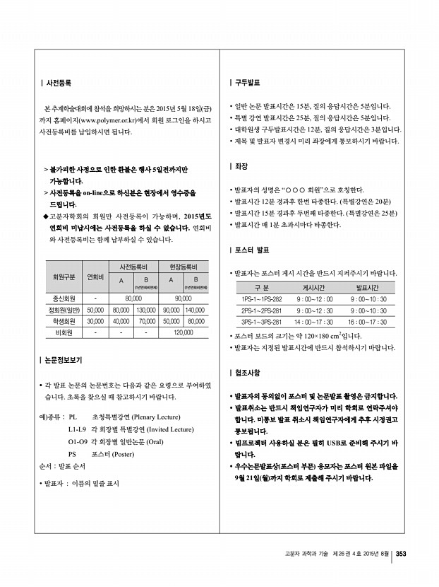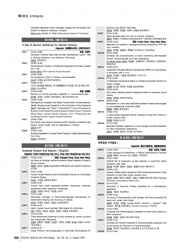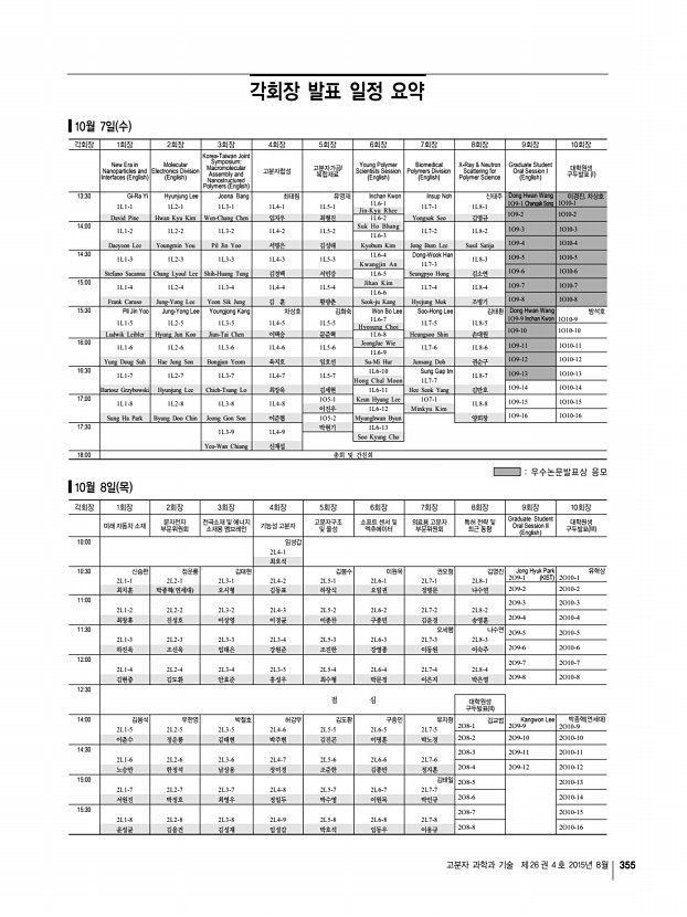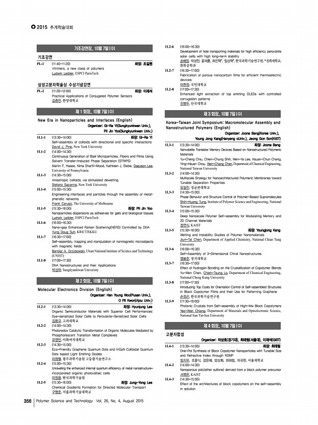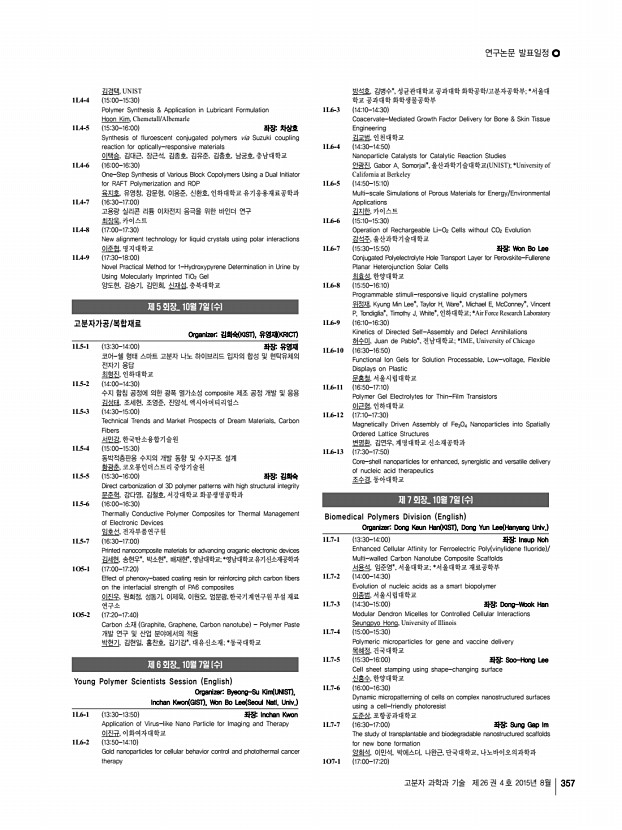 연구논문 발표일정 고분자 과학과 기술 제 26 권 4 호 2015년 8월 357 김경택, UNIST 1L4-4 1500-1530 Polymer Synthesis & Application in Lubricant Formulation Hoon Kim, Chemetall/Albemarle 1L4-5 1530-1600 좌장차상호 Synthesis of fluroescent conjugated polymers via Suzuki coupling reaction for optically-responsive materials 이택승, 김대근, 장근석, 김종호, 김유준, 김충호, 남궁호, 충남대학교 1L4-6 1600-1630 One-Step Synthesis of Various Block Copolymers Using a Dual Initiator for RAFT Polymerization and ROP 육지호, 유영창, 강문형, 이용준, 신환호, 인하대학교 유기응용재료공학과 1L4-7 1630-1700 고용량 실리콘 리튬 이차전지 음극을 위한 바인더 연구 최장욱, 카이스트 1L4-8 1700-1730 New alignment technology for liquid crystals using polar interactions 이준협, 명지대학교 1L4-9 1730-1800 Novel Practical Method for 1-Hydroxypyrene Determination in Urine by Using Molecularly Imprinted Ti...