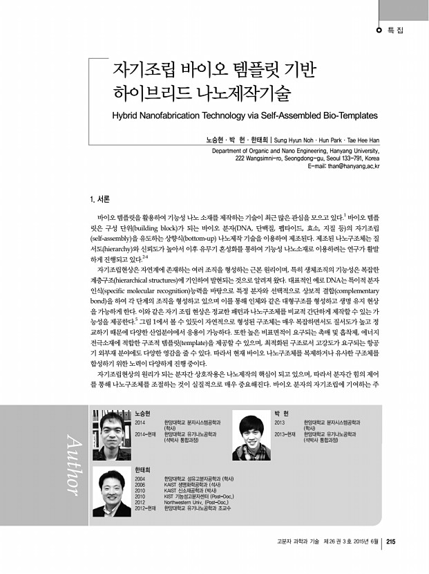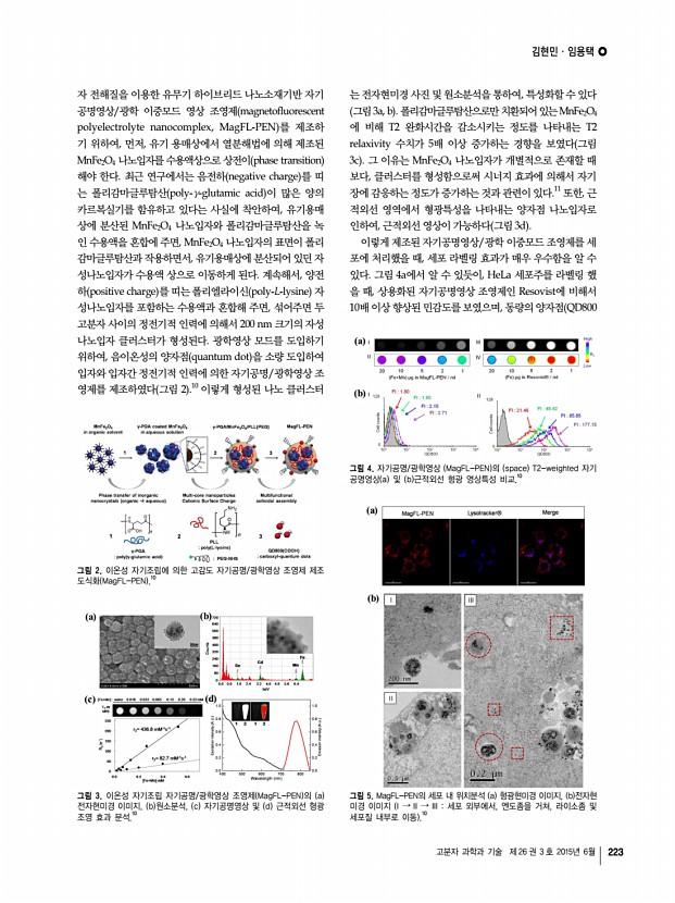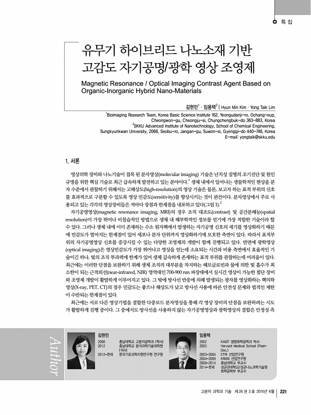 특 집 고분자 과학과 기술 제 26 권 3 호 2015년 6월 221 유무기 하이브리드 나노소재 기반 고감도 자기공명/광학 영상 조영제 Magnetic Resonance Optical Imaging Contrast Agent Based on Organic-Inorganic Hybrid Nano-Materials 김현민1ㆍ임용택2 | Hyun Min KimㆍYong Taik Lim 1 Bioimaging Research Team, Korea Basic Science Institute 162, Yeongudanji-ro, Ochang-eup, Cheongwon-gu, Cheongju-si, Chungchengbuk-do 363-883, Korea 2 SKKU Advanced Institute of Nanotechnology, School of Chemical Engineering, Sungkyunkwan University, 2066, Seobu-ro, Jangan-gu, Suwon-si, Gyenggi-do 440-746, Korea E-mailyongtaik@skku.edu 김현민 2008 충남대학교 고분자공학과 학사 2012 충남대학교 분석과학기술대학원 석사 2012-현재 한국기초과학지원연구원 연구원 임용택 2002 KAIST 생명화학공학과 박사 2003 Harvard Medical School PostDoc. 2003-2004 ETRI 선임연구원 2004-2009 KRIBB 선임연구원 2009-2014 충남대학교 ...