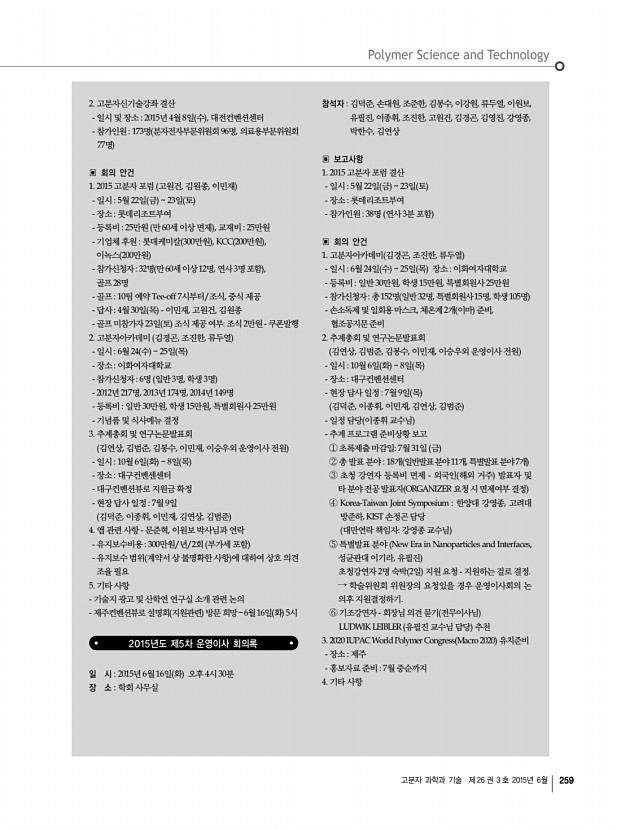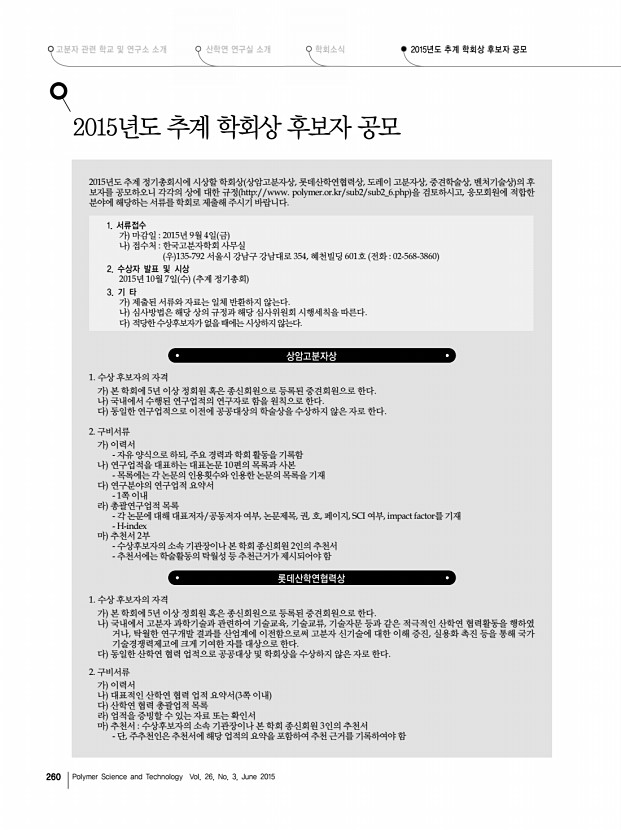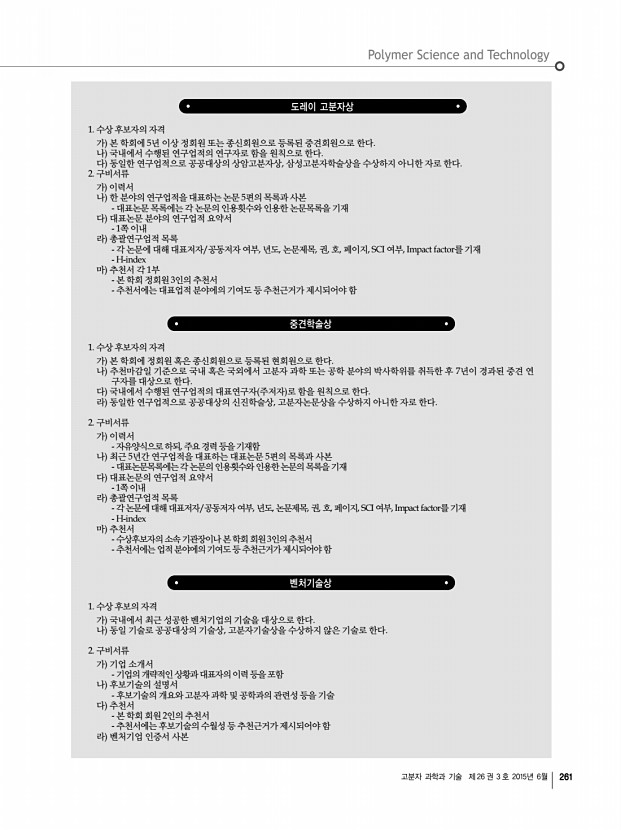 ...논문에 대해 대표저자/공동저자 여부, 논문제목, 권, 호, 페이지, SCI 여부, impact factor를 기재 H-index 마 추천서 2부 수상후보자의 소속 기관장이나 본 학회 종신회원 2인의 추천서 추천서에는 학술활동의 탁월성 등 추천근거가 제시되어야 함 롯데산학연협력상 1. 수상 후보자의 자격 가 본 학회에 5년 이상 정회원 혹은 종신회원으로 등록된 중견회원으로 한다. 나 국내에서 고분자 과학기술과 관련하여 기술교육, 기술교류, 기술자문 등과 같은 적극적인 산학연 협력활동을 행하였 거나, 탁월한 연구개발 결과를 산업계에 이전함으로써 고분자 신기술에 대한 이해 증진, 실용화 촉진 등을 통해 국가 기술경쟁력제고에 크게 기여한 자를 대상으로 한다. 다 동일한 산학연 협력 업적으로 공공대상 및 학회상을 수상하지 않은 자로 한다. 2. 구비서류 가 이력서 나...