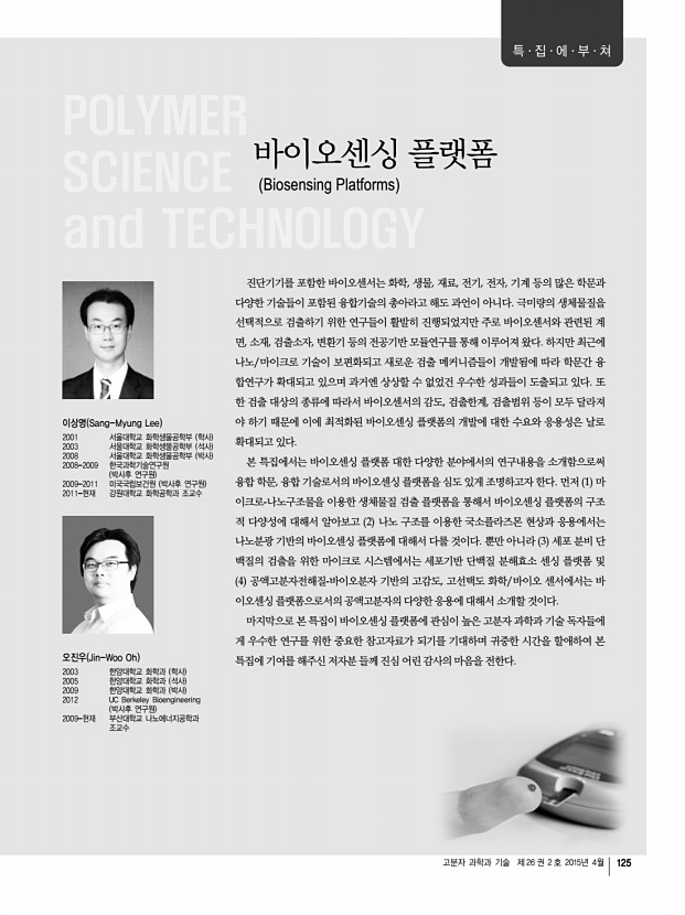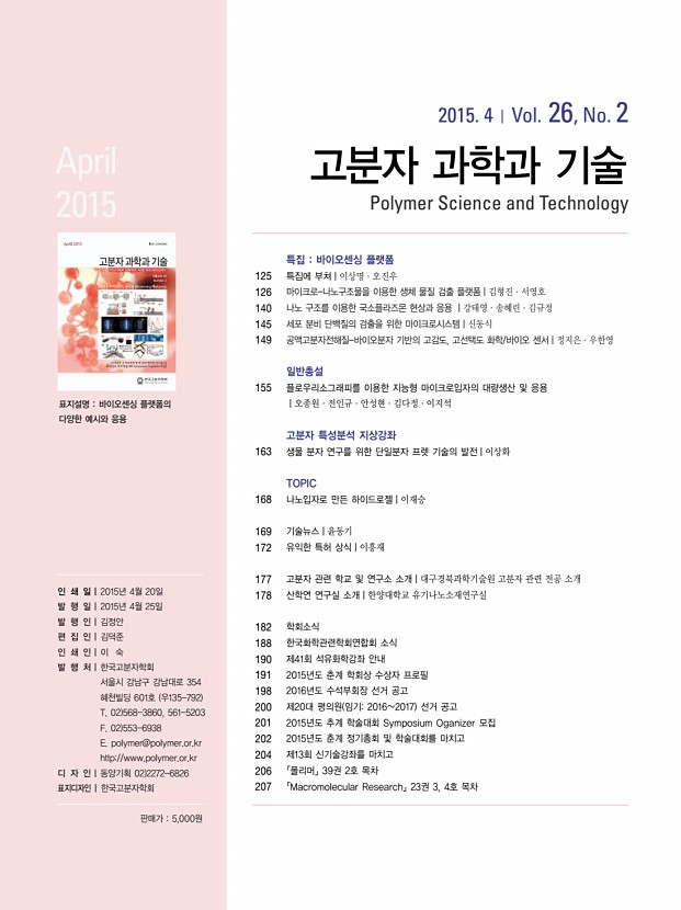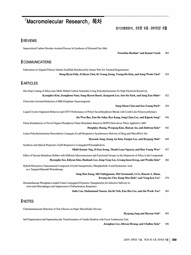 고분자 과학과 기술 제 26 권 3 호 2015년 6월 269 「Macromolecular Research」목차 정기간행영문지_ 23권 5호 ․ 2015년 5월 REVIEWS Supercritical Carbon Dioxide-Assisted Process In Synthesis of Polymer/Clay Melt Norazlina Hashim* and Kamal Yusoh 403 COMMUNICATIONS Fabrication of Aligned Fibrous Tubular Scaffolds Reinforced by Suture Wire for Tracheal Regeneration Dong-Hyun Paik, Ji-Hyun Choi, Ki Young Jeong, Young-Du Kim, and Sung-Wook Choi* 418 ARTICLES One-Step Coating of Silica onto Multi-Walled Carbon Nanotubes Using Polyethyleneimine for High Electrical Resistivity Kyunghee Kim, Jeonghoon Nam, Sung-Hyeon Baeck, Kangseok Lee, Soo-Jin Park, and Sang Eun Shim* 422 Ultraviolet-Assisted Reduction of BBL/Graphene Nanocomposite Sung-Moon Choi and Soo-Young Park* 428 Liquid Crystal Alignment Behavior and OTFT Performance of Poly 3-hexylthiophene Blends with Comb-Like Poly oxyethylene Jin Woo Bae, Eun Ho Sohn, Hyo Kang, Jong Chan Lee, and Kigook Song* 436 Flame Reta...