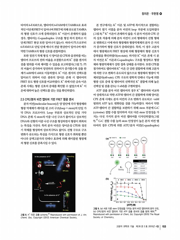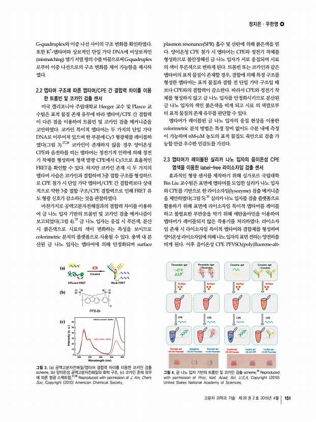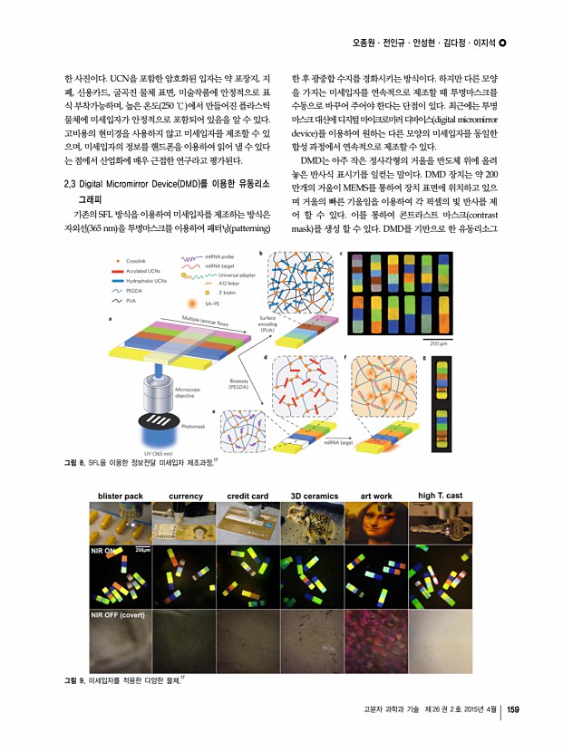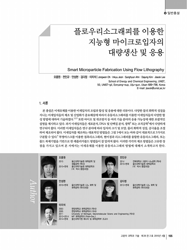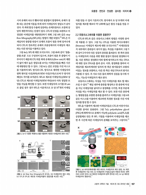 오종원ㆍ전인규ㆍ안성현ㆍ김다정ㆍ이지석 고분자 과학과 기술 제 26 권 2 호 2015년 4월 157 a d g b e h c f i 그림 3. a-i 다양한 투명마스크를 이용하여 제조한 미세입자의 SEM 사진.9 그림 4. a Stop flow lithography의 모식도, b 미세입자의 제조 과정, c CFL과 SFL로 제조된 미세입자들의 정밀도를 비교한 사진.10 그림 5. a 바이오에세이를 위한 바코드 미세입자의 제조 방법, b 제조 후 미세입자의 가상 사진, c 미세입자의 구성요소 감지 부분과 바코드 영역 으로 나뉘어 있다 , d 제조된 미세입자의 광학 현미경 사진, eg 제조된 미세입자의 형광사진.11 시켜 유체의 속도가 빨라지면 광중합이 발생하여, 유체가 경 화 되는 중간에 이동을 하게 되어 미세입자의 정밀도가 낮아 진다. 즉 최대 합성 수율에 상응하는 유체흐름속도 조절에 상 당히 제한적이라는 단점이 있다. CFL의...