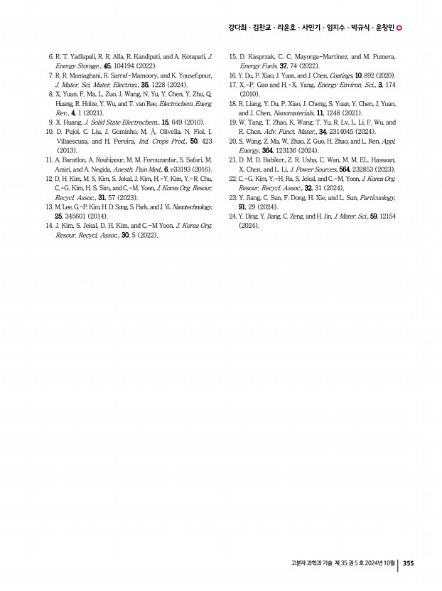 강다희ㆍ김찬교ㆍ라윤호ㆍ사민기ㆍ임지수ㆍ박규식ㆍ윤창민 고분자 과학과 기술 제 35 권 5 호 2024년 10월 355 6. R. T. Yadlapali, R. R. Alla, R. Kandipati, and A. Kotapati, J. Energy Storage., 45, 104194 2022 7. R. R. Mamaghani, R. Sarraf-Mamoory, and K. Yousefipour, J. Mater. Sci. Mater. Electron., 35, 1228 2024 8. X. Yuan, F. Ma, L. Zuo, J. Wang, N. Yu, Y. Chen, Y. Zhu, Q. Huang, R. Holze, Y. Wu, and T. van Ree, Electrochem. Energ. Rev., 4, 1 2021 9. X. Huang, J. Solid State Electrochem., 15, 649 2010 10. D. Pujol, C. Liu, J. Gominho, M. Olivella, N. Fiol, I. Villaescusa, and H. Pereira, Ind. Crops Prod., 50, 423 2013 11. A. Baratloo, A. Rouhipour, M. M. Forouzanfar, S. Safari, M. Amiri, and A. Negida, Anesth. Pain Med., 6, e33193 2016 12. D. H. Kim, M. S. Kim, S. Jekal, J. Kim, H.-Y. Kim, Y.-R. Chu, C.-G. Kim, H. S. Sim, and C.-M. Yoon, J. Korea Org. Resour. Recycl. Assoc., 31, 57 2023 13. M. Lee, G.-P. Kim, H. D. Song, S. Park, and J. Yi, Nanotechn...
