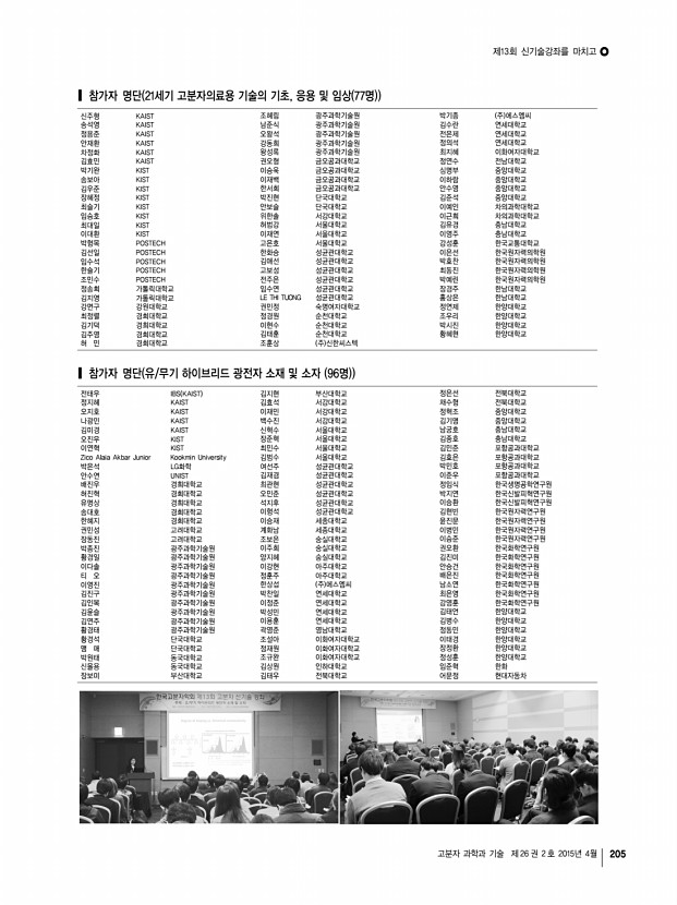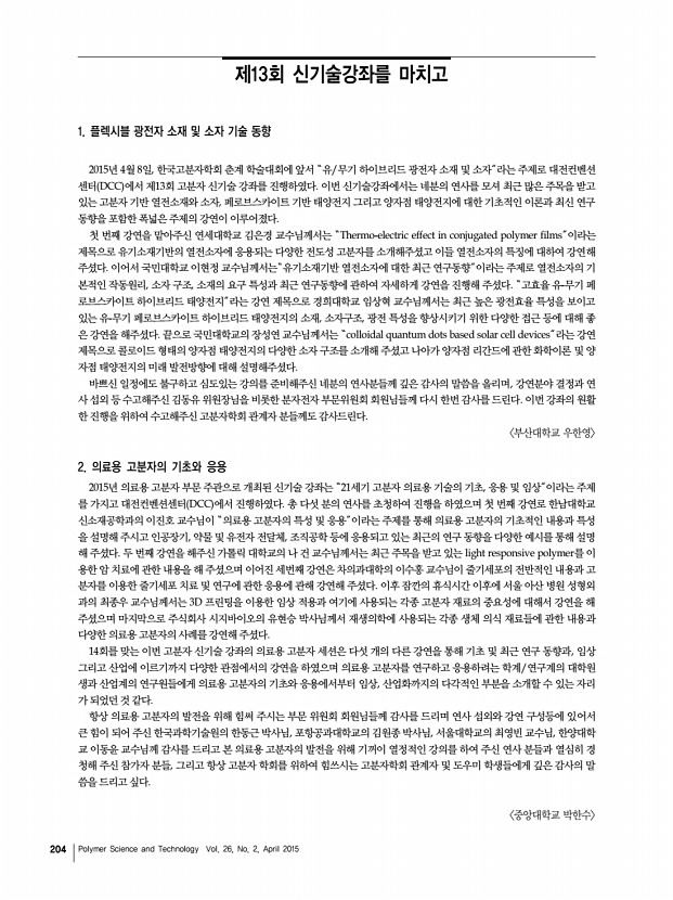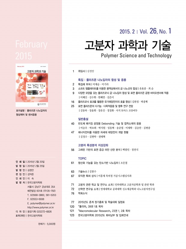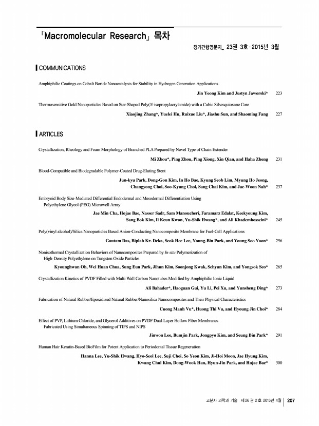 고분자 과학과 기술 제 26 권 2 호 2015년 4월 207 「Macromolecular Research」목차 정기간행영문지_ 23권 3호 ․ 2015년 3월 COMMUNICATIONS Amphiphilic Coatings on Cobalt Boride Nanocatalysts for Stability in Hydrogen Generation Applications Jin Yeong Kim and Justyn Jaworski* 223 Thermosensitive Gold Nanoparticles Based on Star-Shaped Poly N-isopropylacrylamide with a Cubic Silsesquioxane Core Xiaojing Zhang*, Yuelei Hu, Ruixue Liu*, Jiashu Sun, and Shaoming Fang 227 ARTICLES Crystallization, Rheology and Foam Morphology of Branched PLA Prepared by Novel Type of Chain Extender Mi Zhou*, Ping Zhou, Ping Xiong, Xin Qian, and Haha Zheng 231 Blood-Compatible and Biodegradable Polymer-Coated Drug-Eluting Stent Jun-kyu Park, Dong-Gon Kim, In Ho Bae, Kyung Seob Lim, Myung Ho Jeong, Changyong Choi, Soo-Kyung Choi, Sang Chai Kim, and Jae-Woon Nah* 237 Embryoid Body Size-Mediated Differential Endodermal and Mesodermal Differentiation Using Polyethylene Glycol PEG Microwell...