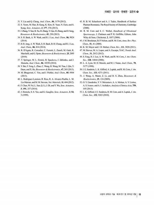 이혜진ㆍ김수희ㆍ한혜연ㆍ김은미 고분자 과학과 기술 제 26 권 1 호 2015년 2월 15 31. Y. Liu and Q. Cheng, Anal. Chem., 84, 3179 2012 32. S. Yeom, M. Han, B. Kang, K. Kim, H. Yuan, N. Eum, and S. Kang, Sens. Actuators, B, 177, 376 2013 33. J. Zhang, Y. Sun, B. Xu, H. Zhang, Y. Gao, H. Zhang, and D. Song, Biosensors & Bioelectronics, 45, 230 2013 34. S. H. Baek, A. W. Wark, and H. J. Lee, Anal. Chem., 86, 9824 2014 35. H. R. Jang, A. W. Wark, S. H. Baek, B. H. Chung, and H. J. Lee, Anal. Chem., 86, 814 2014 36. R. DAgata, R. Corradini, C. Ferretti, L. Zanoli, M. Gatti, R. Marchelli, and G. Spoto, Biosensors & Bioelectronics, 25, 2095 2010 37. T. Springer, M. L. Ermini, B. Spackova, J. Jablonku, and J. Homola, Anal. Chem., 86, 10350 2014 38. Y. Bai, F. Feng, L. Zhao, C. Wang, H. Wang, M. Tian, J. Qin, Y. Duan, and X. He, Biosensors & Bioelectronics, 47, 265 2013 39. M. Bhagawati, C. You, and J. Piehler, Anal. Chem., 85, 9564 2013 40. L. Rodriguez-Lorenzo, R. Rica,...