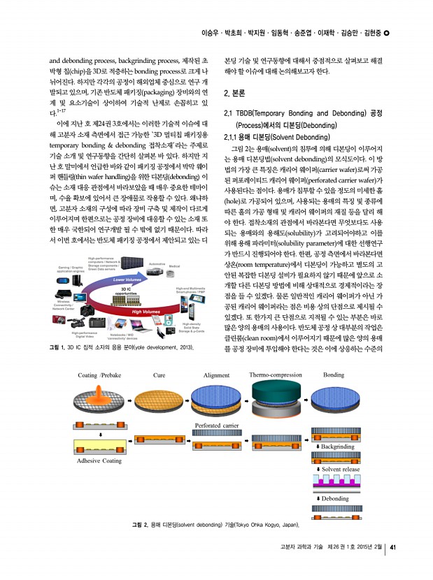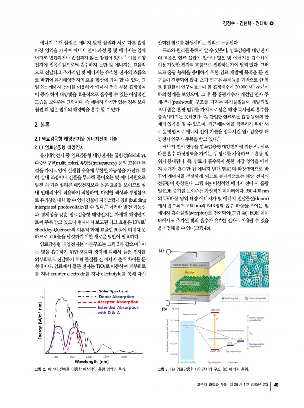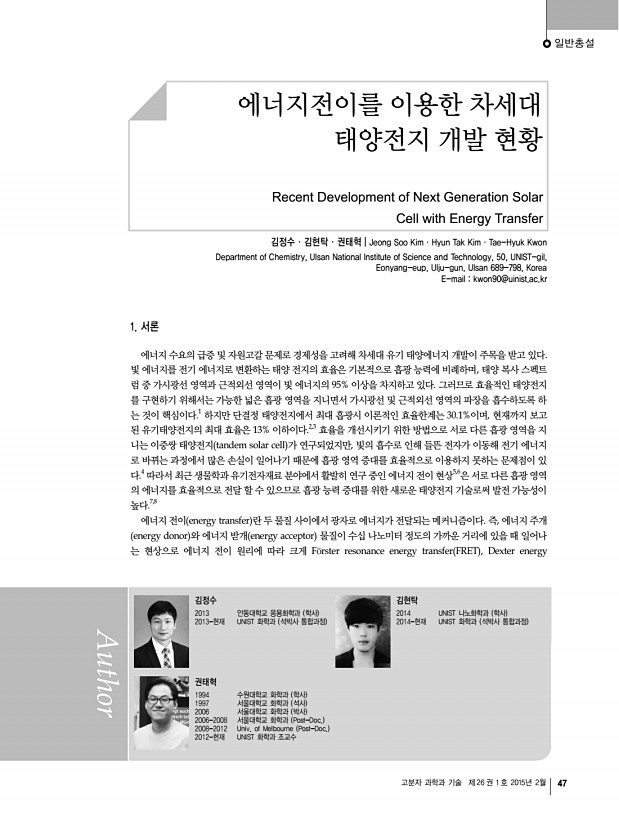 일반총설 고분자 과학과 기술 제 26 권 1 호 2015년 2월 47 김정수 2013 안동대학교 응용화학과 학사 2013-현재 UNIST 화학과 석박사 통합과정 김현탁 2014 UNIST 나노화학과 학사 2014-현재 UNIST 화학과 석박사 통합과정 권태혁 1994 수원대학교 화학과 학사 1997 서울대학교 화학과 석사 2006 서울대학교 화학과 박사 2006-2008 서울대학교 화학과 Post-Doc. 2008-2012 Univ. of Melbourne Post-Doc. 2012-현재 UNIST 화학과 조교수 에너지전이를 이용한 차세대 태양전지 개발 현황 Recent Development of Next Generation Solar Cell with Energy Transfer 김정수ㆍ김현탁ㆍ권태혁 | Jeong Soo KimㆍHyun Tak KimㆍTae-Hyuk Kwon Department of Chemistry, Ulsan National Institute of Science and Technology, 50, UNIST-gil, Eonyang-eup, Ulju-gun, Ulsan 689-798, Korea E-mail kwon90@uinist.ac.kr 1. 서론 에너지 수요의 급증 및 자원고갈 문제로 경제성을 고려해 차세대 유...