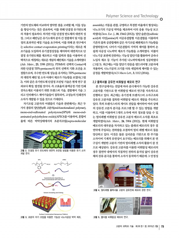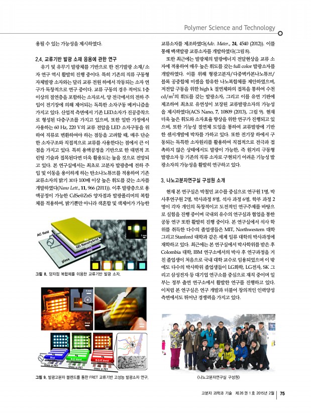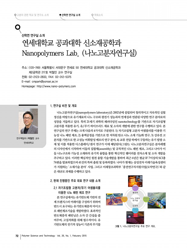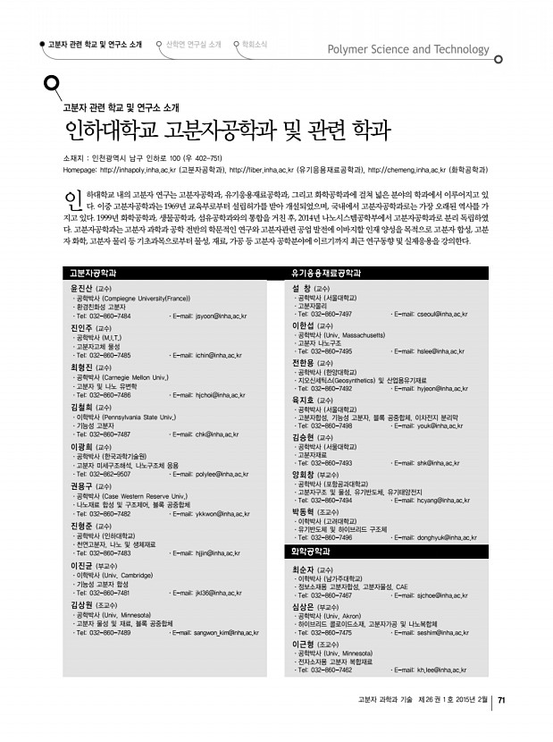 고분자 과학과 기술 제 26 권 1 호 2015년 2월 71 인 고분자 관련 학교 및 연구소 소개 인하대학교 고분자공학과 및 관련 학과 소재지 인천광역시 남구 인하로 100 우 402-751 Homepagehttp//inhapoly.inha.ac.kr 고분자공학과 , http//fiber.inha.ac.kr 유기응용재료공학과 , http//chemeng.inha.ac.kr 화학공학과 하대학교 내의 고분자 연구는 고분자공학과, 유기응용재료공학과, 그리고 화학공학과에 걸쳐 넓은 분야의 학과에서 이루어지고 있 다. 이중 고분자공학과는 1969년 교육부로부터 설립허가를 받아 개설되었으며, 국내에서 고분자공학과로는 가장 오래된 역사를 가 지고 있다. 1999년 화학공학과, 생물공학과, 섬유공학과와의 통합을 거친 후, 2014년 나노시스템공학부에서 고분자공학과로 분리 독립하였 다. 고분자공학과는 고분자 과학과 공학 전반의 학문적인 연구와 고분자관...