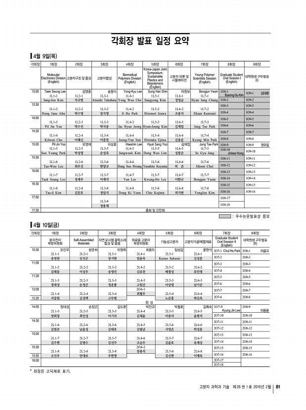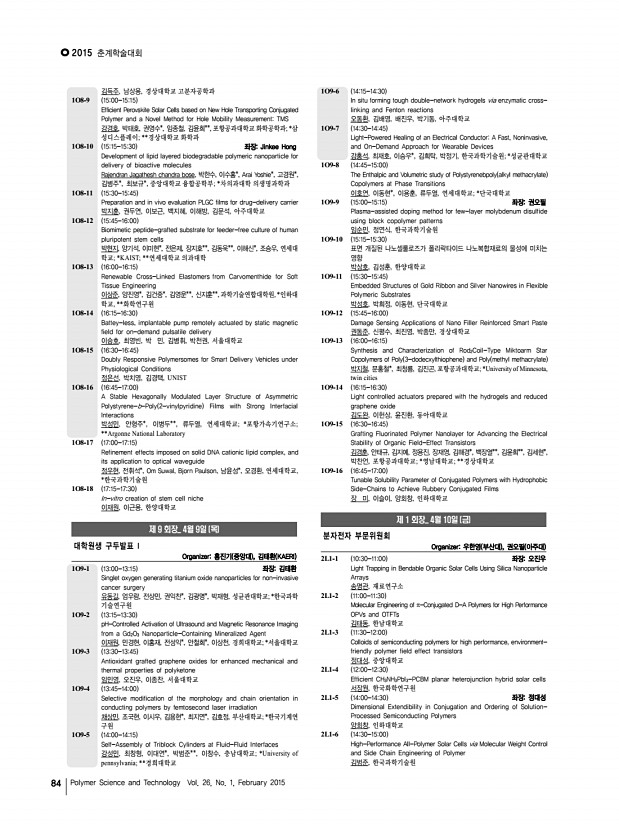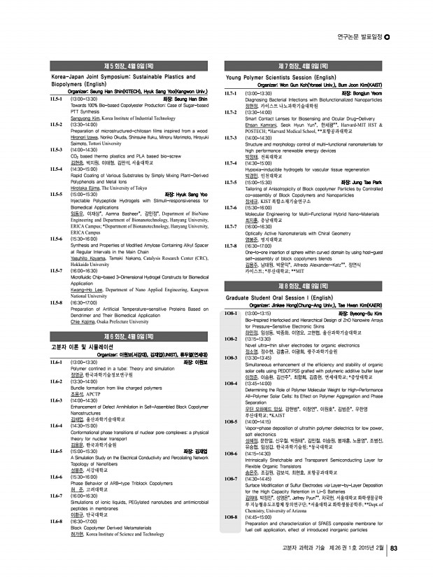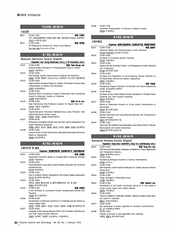 ... Novel Method for Hole Mobility MeasurementTMS 강경호, 박태호, 권영수*, 임종철, 김윤희**, 포항공과대학교 화학공학과; *삼 성디스플레이; **경상대학교 화학과 1O8-10 1515-1530 좌장Jinkee Hong Development of lipid layered biodegradable polymeric nanoparticle for delivery of bioactive molecules Rajendran Jagathesh chandra bose, 박한수, 이수홍*, Arai Yoshie*, 고경원*, 김병주*, 최보규*, 중앙대학교 융합공학부; *차의과대학 의생명과학과 1O8-11 1530-1545 Preparation and in vivo evaluation PLGC films for drug-delivery carrier 박지훈, 권두연, 이보근, 백지혜, 이해방, 김문석, 아주대학교 1O8-12 1545-1600 Biomimetic peptide-grafted substrate for feeder-free culture of human pluripotent stem cells 박현지, 양기석, 이미현*, 전은제, 장지호**, 김동욱**, 이해신*, 조승우, 연세대 학교; *KAIST; **연세대학교 의과대학 1O8-13 1600-1615 Renewable Cross-Linked Elastomers from Car...