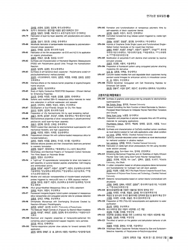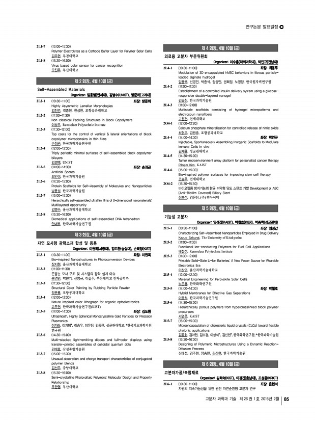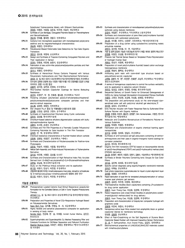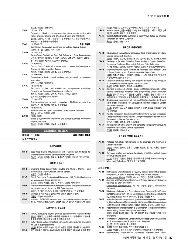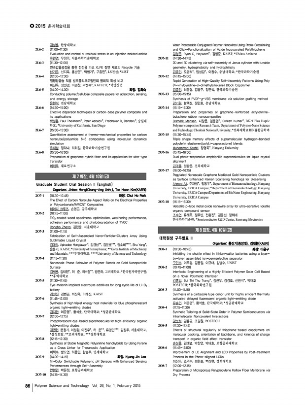 2015 춘계학술대회 86 Polymer Science and Technology Vol. 26, No. 1, February 2015 김성훈, 한양대학교 2L6-2 1100-1130 Evaluation and control of residual stress in an injection molded article 류민영, 우정우, 서울과학기술대학교 2L6-3 1130-1200 연속압출공정을 통한 전선용 가교 XLPE 절연 재료의 Recycle 기술 남기준, 신지욱, 홍순만*, 백범기*, 구종민*, LS전선; *KIST 2L6-4 1200-1230 열팽창캡슐 적용 발포폴리프로필렌의 물리적 특성 비교 하진욱, 정선경, 이평찬, 곽성복*, KATECH; *덕양산업 2L6-5 1400-1430 좌장김희숙 Conducting polymer/cellulose composite papers for adsorption, sensing, and energy storage 윤현석, 전남대학교 2L6-6 1430-1500 Effective dispersion techniques of carbon-base polymer composite and its applications 박성훈, Paul Theilmann*, Peter Asbeck*, Prabhakar R. Bandaru*, 숭실대 학교; *University of California, San Diego 2L6-7 1500-1530 Quantitative assessment of ...