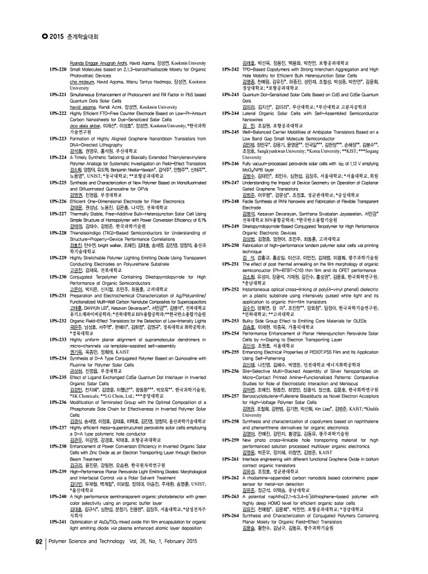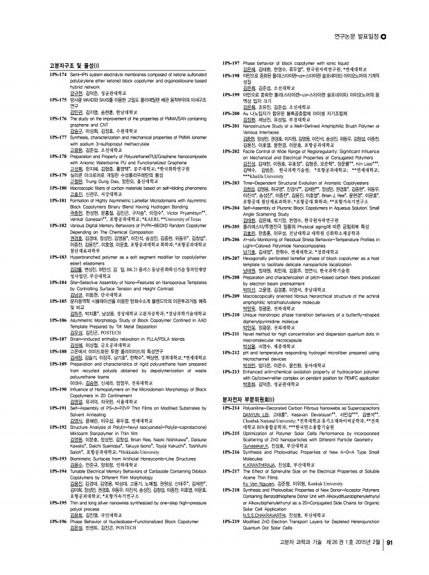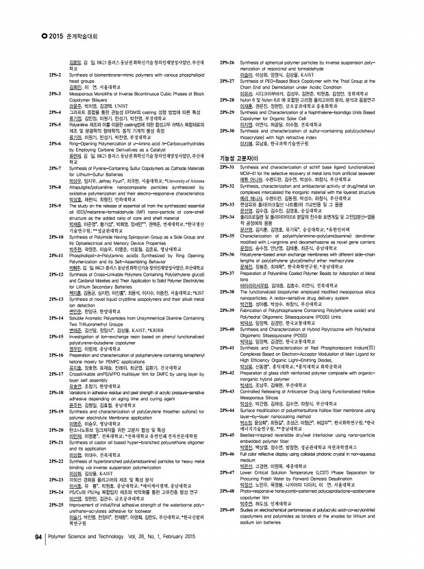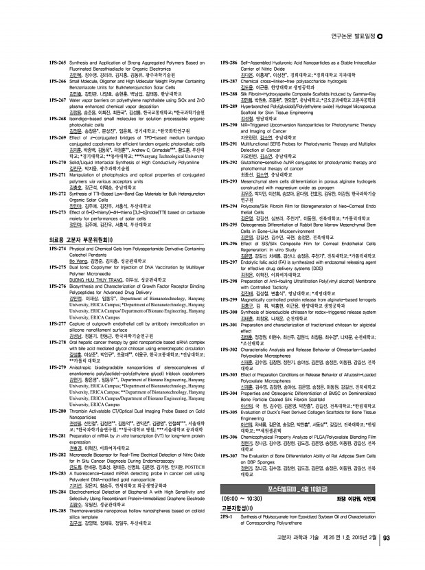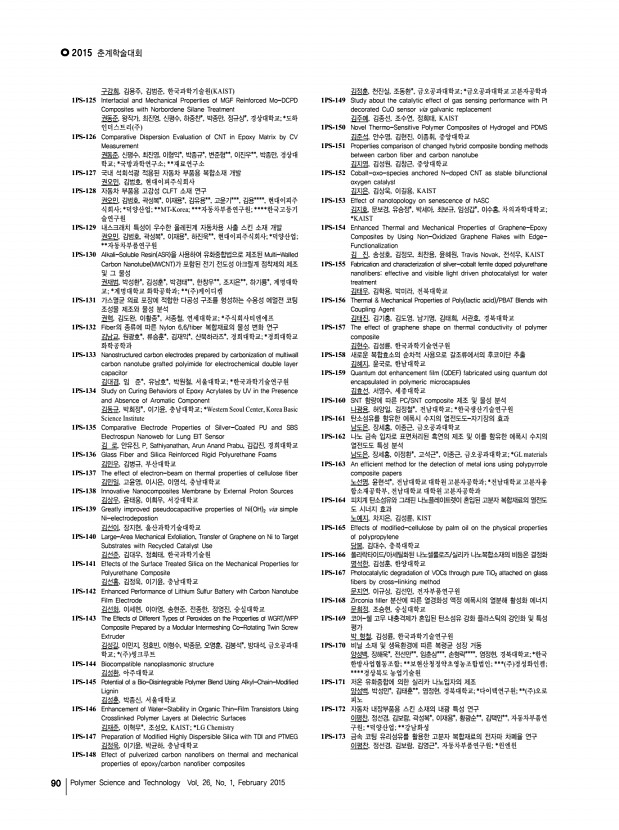 2015 춘계학술대회 90 Polymer Science and Technology Vol. 26, No. 1, February 2015 구강희, 김용주, 김범준, 한국과학기술원 KAIST 1PS-125 Interfacial and Mechanical Properties of MGF Reinforced Mo-DCPD Composites with Norbordene Silane Treatment 권동준, 왕작가, 최진영, 신평수, 하중찬*, 박종만, 정규상*, 경상대학교; *도하 인더스트리 주 1PS-126 Comparative Dispersion Evaluation of CNT in Epoxy Matrix by CV Measurement 권동준, 신평수, 최진영, 이형익*, 박종규*, 변준형**, 이진우**, 박종만, 경상대 학교; *국방과학연구소; **재료연구소 1PS-127 국내 석회석광 적용된 자동차 부품용 복합소재 개발 권오민, 김범호, 현대이피주식회사 1PS-128 자동차 부품용 고강성 CLFT 소재 연구 권오민, 김범호, 곽성복*, 이재용*, 김유용**, 고윤기***, 김용****, 현대이피주 식회사; *덕양산업; **MT-Korea; ***자동차부품연구원; ****한국고등기 술...