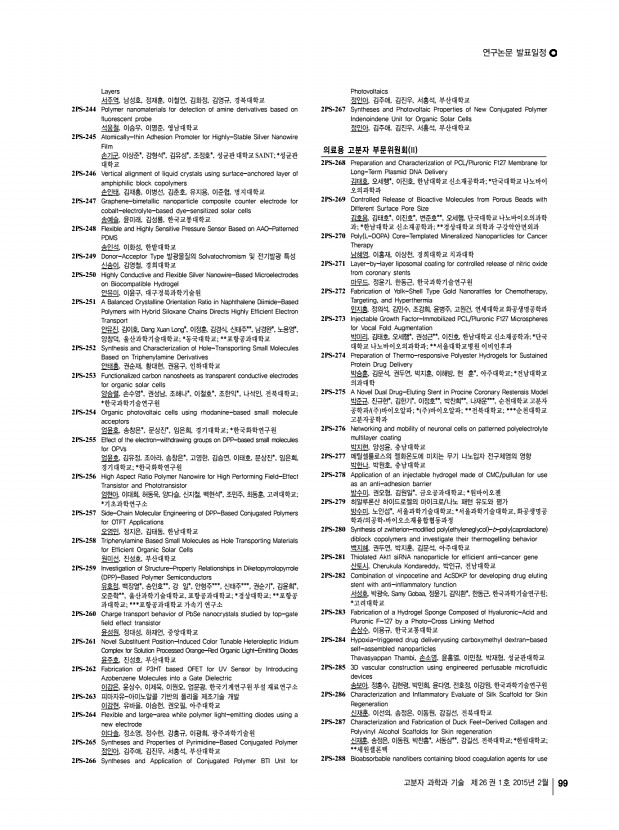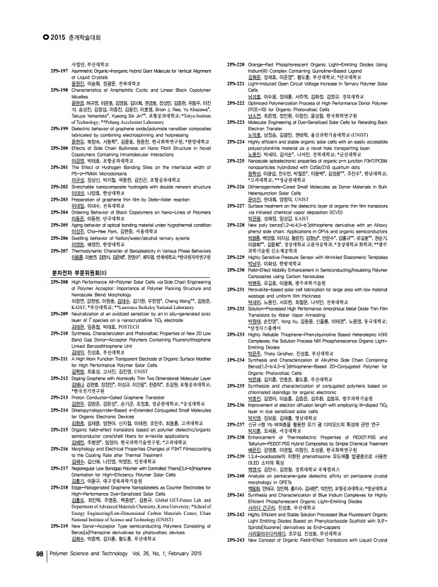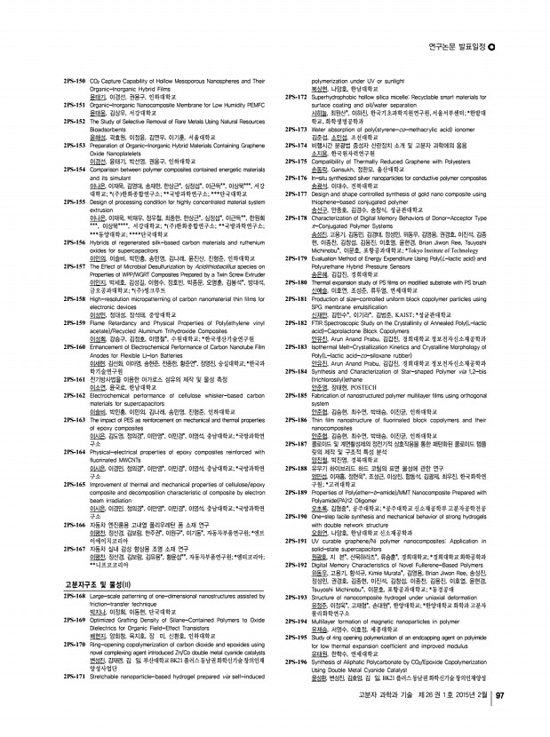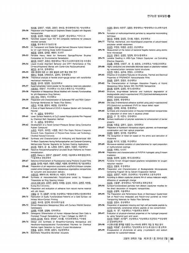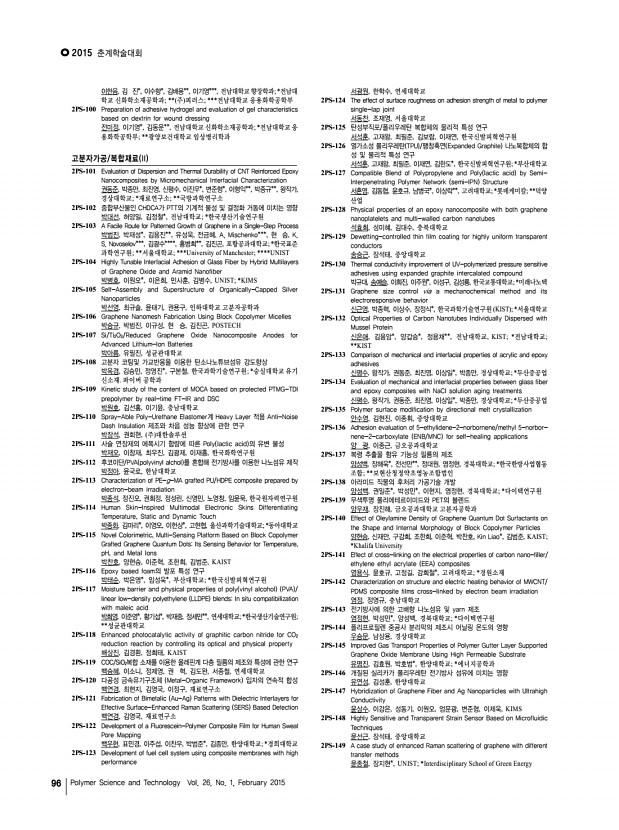 ...wound dressing 전미정, 이기영*, 김동운**, 전남대학교 신화학소재공학과; *전남대학교 응 용화학공학부; **광양보건대학교 임상병리학과 고분자가공/복합재료 II 2PS-101 Evaluation of Dispersion and Thermal Durability of CNT Reinforced Epoxy Nanocomposites by Micromechanical Interfacial Characterization 권동준, 박종만, 최진영, 신평수, 이진우*, 변준형*, 이형익**, 박종규**, 왕작가, 경상대학교; *재료연구소; **국방과학연구소 2PS-102 중합부산물인 CHDCA가 PTT의 기계적 물성 및 결정화 거동에 미치는 영향 박대선, 허양일, 김정철*, 전남대학교; *한국생산기술연구원 2PS-103 A Facile Route for Patterned Growth of Graphene in a Single-Step Process 박범진, 박재성*, 김용진**, 유성욱, 전금혜, A. Mischenko***, 현 승, K. S. Novoselov***, 김광수****, 홍병희**, 김진곤, 포항공과대학교; *한국표준 과학연구원; **서울대학교; ***Univ...