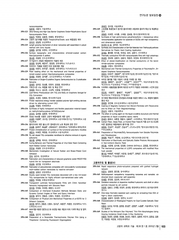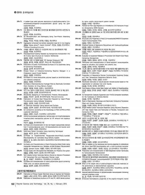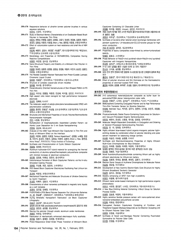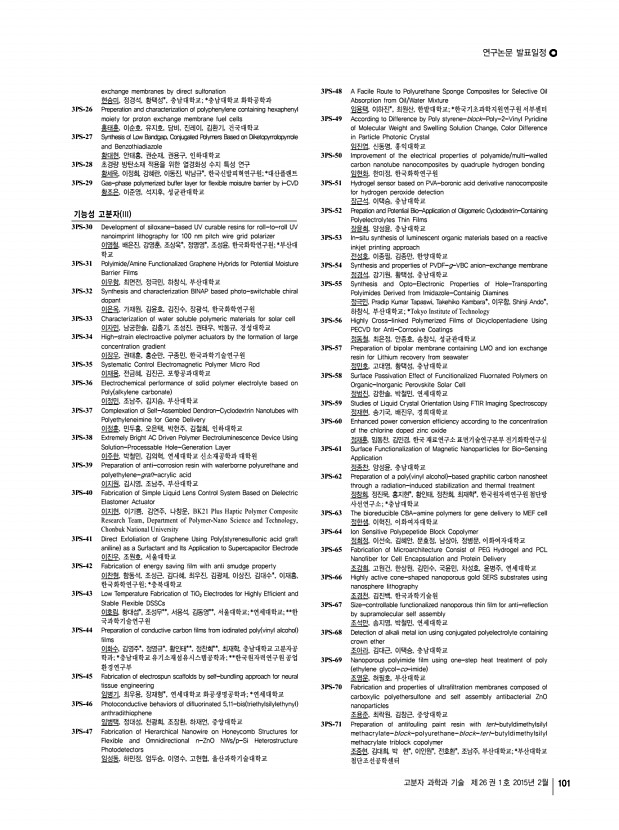 연구논문 발표일정 고분자 과학과 기술 제 26 권 1 호 2015년 2월 101 exchange membranes by direct sulfonation 현승미, 정경석, 황택성*, 충남대학교; *충남대학교 화학공학과 3PS-26 Preperation and characterization of polyphenylene containing hexaphenyl moiety for proton exchange membrane fuel cells 홍태훈, 이순호, 유지호, 담비, 진레이, 김환기, 건국대학교 3PS-27 Synthesis of Low Bandgap, Conjugated Polymers Based on Diketopyrrolopyrrole and Benzothiadiazole 황대현, 안태홍, 권순재, 권용구, 인하대학교 3PS-28 초경량 방탄소재 적용을 위한 열경화성 수지 특성 연구 황세욱, 이정희, 강혜란, 이동진, 박남규*, 한국신발피혁연구원; *대산플랜트 3PS-29 Gas-phase polymerized buffer layer for flexible moisutre barrier by i-CVD 황조은, 이준영, 석지후, 성균관대학교 기능성 고분자 III 3PS-30 Development of siloxane-based UV curable resins for roll-to-roll UV nano...