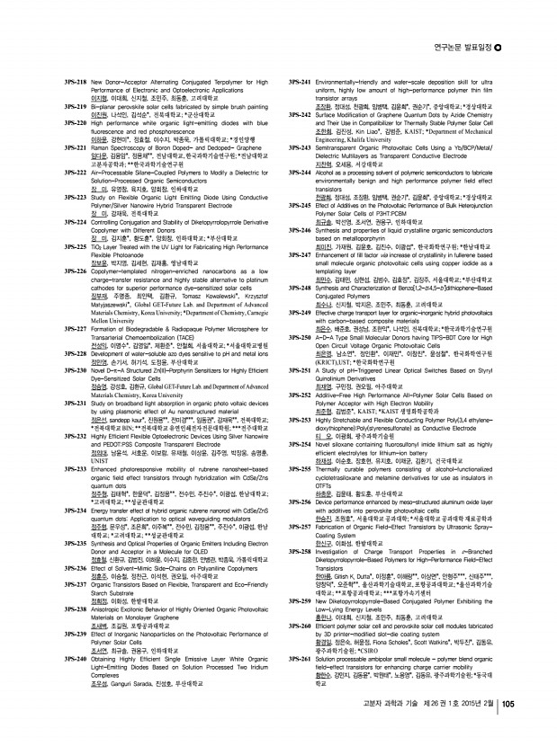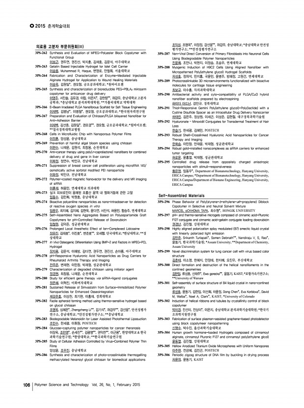 ...aque, 변영로, 안철희, 서울대학교 3PS-264 Fabrication and Characterization of Enzyme-Mediated Injectable Alginate Hydrogel for Application to Wound Healing Materials 이승욱, 김원일*, 권오형, 금오공과대학교; *원바이오젠 3PS-265 Synthesis and characterization of bioreducible PEG-PBLA2 miktoarm copolymer for anticancer drug delivery 이영주, 서진솔, 김유경, 이립, 이은지*, 강한창**, 허강무, 충남대학교 고분자 공학과; *충남대학교 분석과학대학원; **가톨릭대학교 약학대학 3PS-266 E-Beam Irradiated PLGA Nanofibrous Scaffold for Soft Tissue Engineering 이재백, 김병남*, 이병철*, 권오형, 금오공과대학교; *한국원자력연구원 3PS-267 Preparation and Evaluation of Chitosan/PLGA bilayered Nanofiber for Anti-Adhesion Barrier 이재백, 김선종, 김원일*, 권오경**, 권오형, 금오공과대학교; *원바이오젠; **칠곡경북대학교병원 3PS-268 Cells in Microfluidic Chip with Nanoporo...