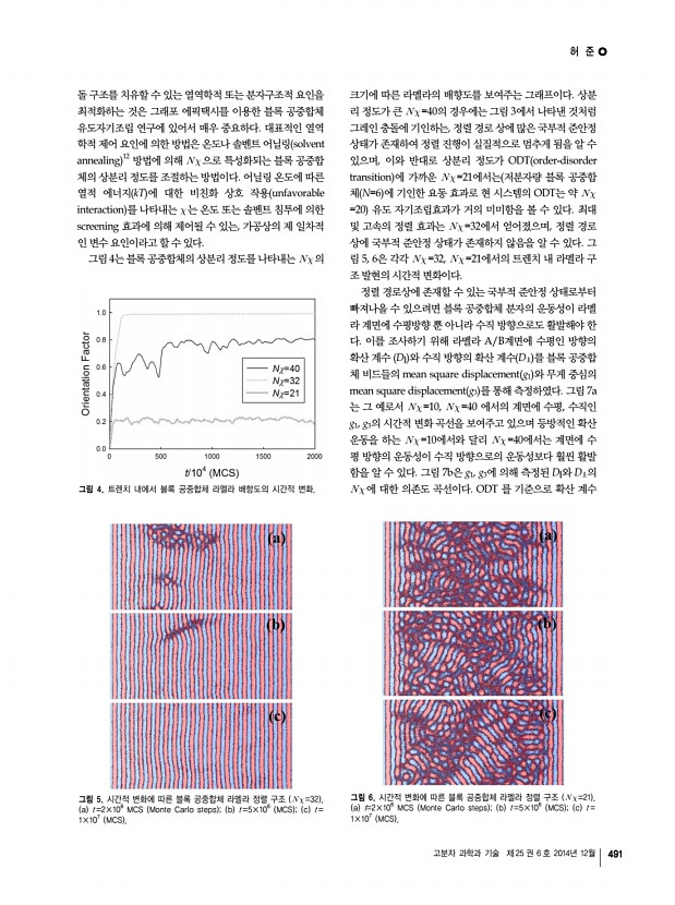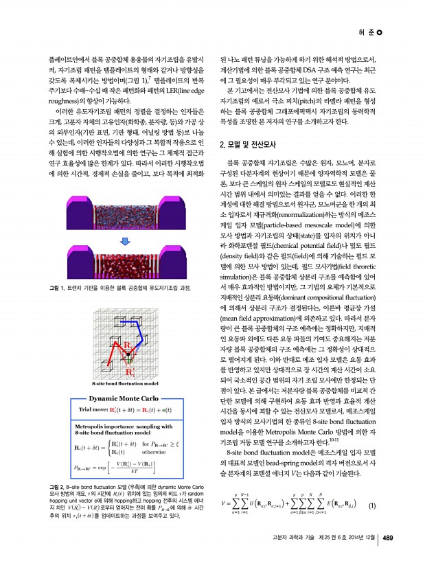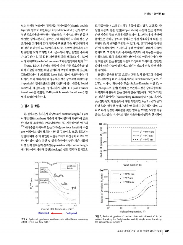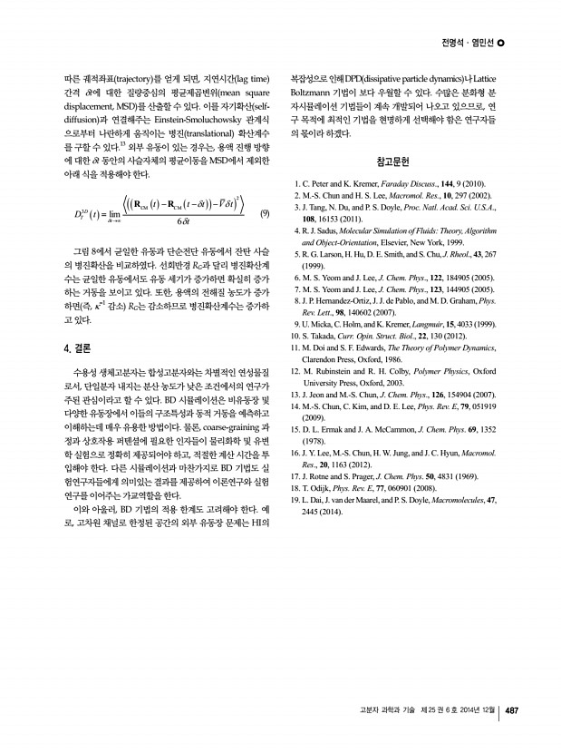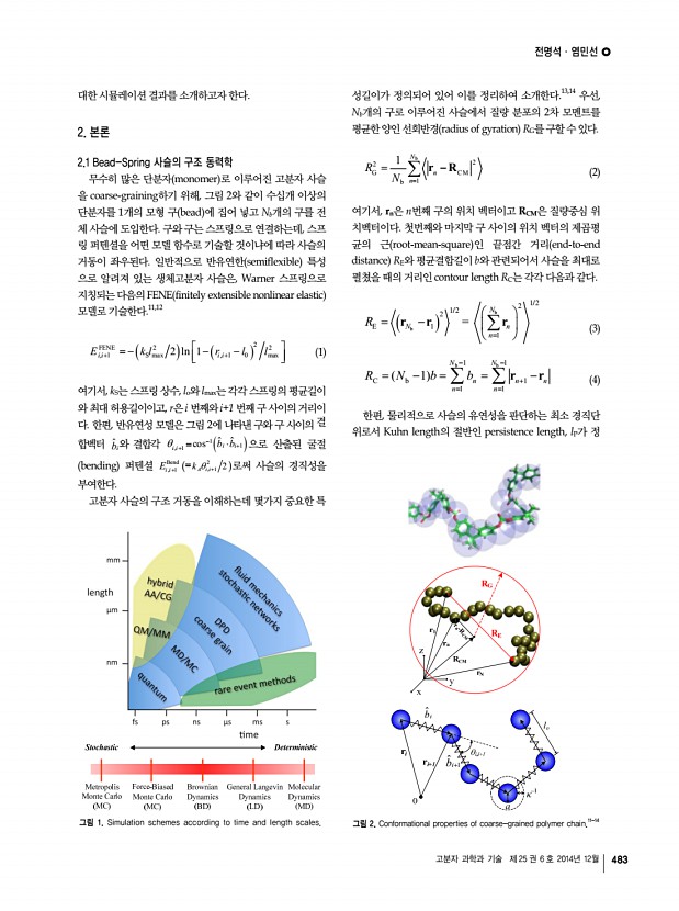 전명석ㆍ염민선 고분자 과학과 기술 제 25 권 6 호 2014년 12월 483 그림 1. Simulation schemes according to time and length scales. n CM b i b i+1 그림 2. Conformational properties of coarse-grained polymer chain.11-14 대한 시뮬레이션 결과를 소개하고자 한다. 2. 본론 2.1 Bead-Spring 사슬의 구조 동력학 무수히 많은 단분자 monomer 로 이루어진 고분자 사슬 을 coarse-graining하기 위해, 그림 2와 같이 수십개 이상의 단분자를 1개의 모형 구 bead 에 집어 넣고 Nb개의 구를 전 체 사슬에 도입한다. 구와 구는 스프링으로 연결하는데, 스프 링 퍼텐셜을 어떤 모델 함수로 기술할 것이냐에 따라 사슬의 거동이 좌우된다. 일반적으로 반유연한 semiflexible 특성 으로 알려져 있는 생체고분자 사슬은, Warner 스프링으로 지칭되는 다음의 FENE finitely extensible nonlinear elastic 모델로 기술한다.11,12 E k l r l l i i i i FENE 2 2 ...