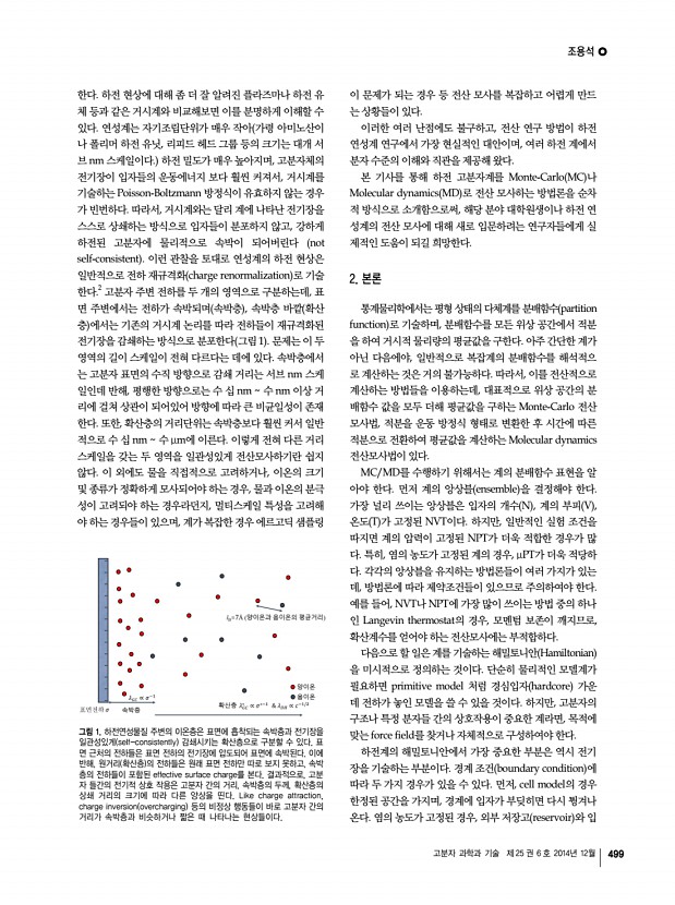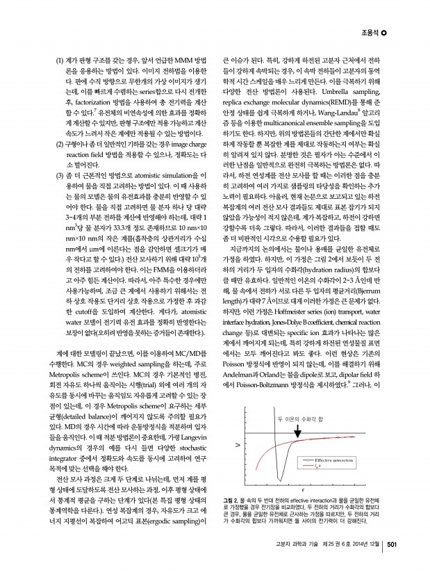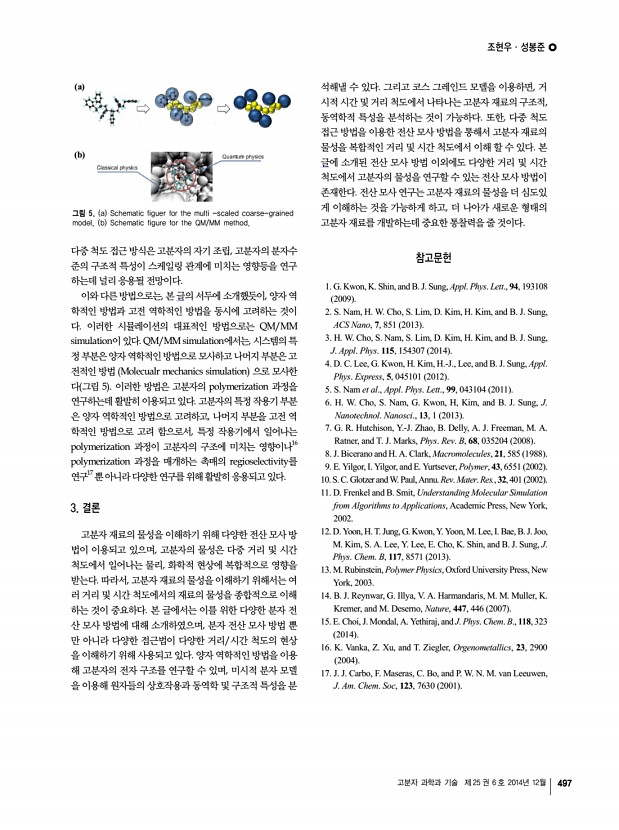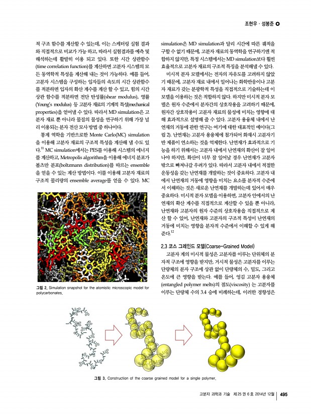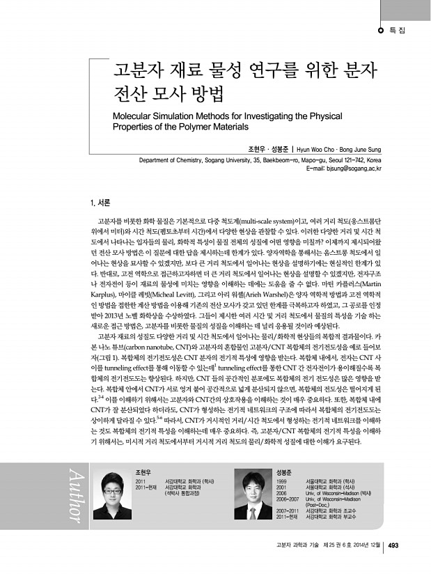 특 집 고분자 과학과 기술 제 25 권 6 호 2014년 12월 493 고분자 재료 물성 연구를 위한 분자 전산 모사 방법 Molecular Simulation Methods for Investigating the Physical Properties of the Polymer Materials 조현우ㆍ성봉준 | Hyun Woo ChoㆍBong June Sung Department of Chemistry, Sogang University, 35, Baekbeom-ro, Mapo-gu, Seoul 121-742, Korea E-mailbjsung@sogang.ac.kr 조현우 2011 서강대학교 화학과 학사 2011-현재 서강대학교 화학과 석박사 통합과정 성봉준 1999 서울대학교 화학과 학사 2001 서울대학교 화학과 석사 2006 Univ. of Wisconsin-Madison 박사 2006-2007 Univ. of Wisconsin-Madison Post-Doc. 2007-2011 서강대학교 화학과 조교수 2011-현재 서강대학교 화학과 부교수 1. 서론 고분자를 비롯한 화학 물질은 기본적으로 다중 척도계 multi-scale system 이고, 여러 거리 척도 옹스트롬단 위에서 미터 와 시간 척도 펨토초부터 시간 에서 다양...
