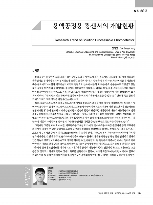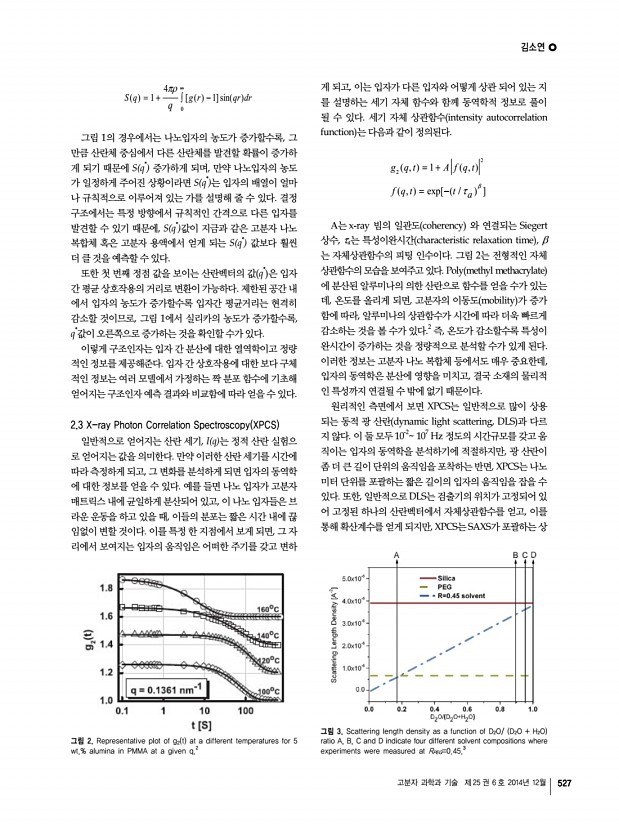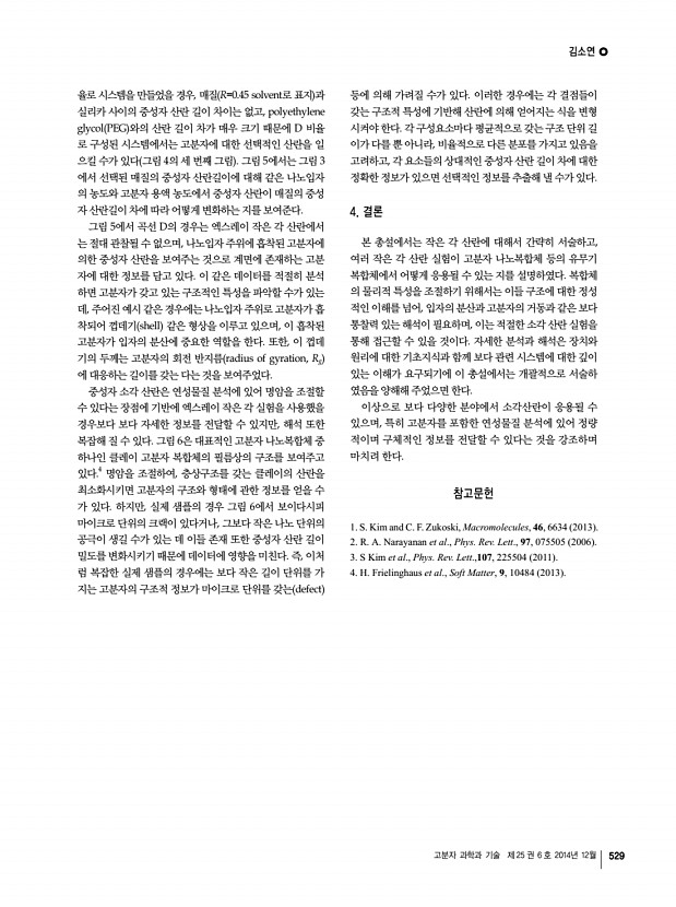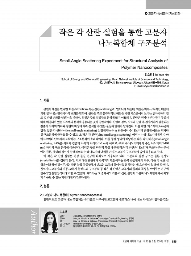 고분자 특성분석 지상강좌 고분자 과학과 기술 제 25 권 6 호 2014년 12월 525 김소연 2007 서울대학교 화학생물공학부 학사 2009 Univ. of Illinois at Urbana-Champaign Chemical Engineering 석사 2011 Univ. of Illinois at Urbana-Champaign Chemical Engineering 박사 2012-2014 Princeton University Post-Doc. 2014 울산과학기술대학교 에너지 및 화학공학부 조교수 작은 각 산란 실험을 통한 고분자 나노복합체 구조분석 Small-Angle Scattering Experiment for Structural Analysis of Polymer Nanocomposites 김소연 | So Youn Kim School of Energy and Chemical Engineering, Ulsan National Institute of Science and Technology, 50, UNIST-gil, Eonyang-eup, Ulju-gun, Ulsan 689-798, Korea E-mailsoyounkim@unist.ac.kr 1. 서론 광원이 매질을 만나면 회절 diffraction 혹은 산란 scattering 이 일어나게 되는데, 회절은 매우 규칙적인 배열에 의해 일어나는 전자기파의 변화를 말하며, 산란은 주...