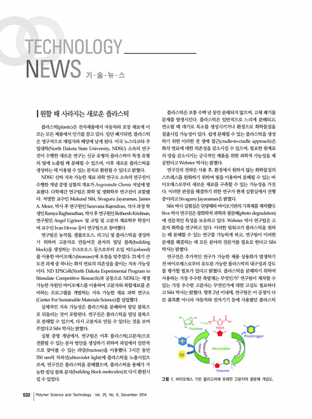 ...에서 인기를 끌고 있다. 일단 폐기되면, 플라스틱 은 영구적으로 매립지와 해양에 남게 된다. 미국 노스다코타 주 립대학 North Dakota State University, NDSU 소속의 연구 진이 수행한 새로운 연구는 신규 유형의 플라스틱이 특정 유형 의 빛에 노출될 때 분해될 수 있으며, 이후 새로운 플라스틱을 생성하는 데 이용될 수 있는 분자로 환원될 수 있다고 밝혔다. NDSU 산하 지속 가능한 재료 과학 연구소 소속의 연구진이 수행한 개념 증명 실험의 개요가 Angewandte Chemie 저널에 발 표됐다. 다학제간 연구팀은 화학 및 생화학부 연구진이 포함됐 다. 저명한 교수인 Mukund Sibi, Sivaguru Jayaraman, James A. Meier, 박사 후 연구원인 Saravana Rajendran, 석사 과정 학 생인Ramya Raghunathan, 박사 후 연구원인Retheesh Krishnan, 연구원인 Angel Ugrinov 및 코팅 및 고분자 재료학부 학장이 며 교수인 Ivan Hevu...