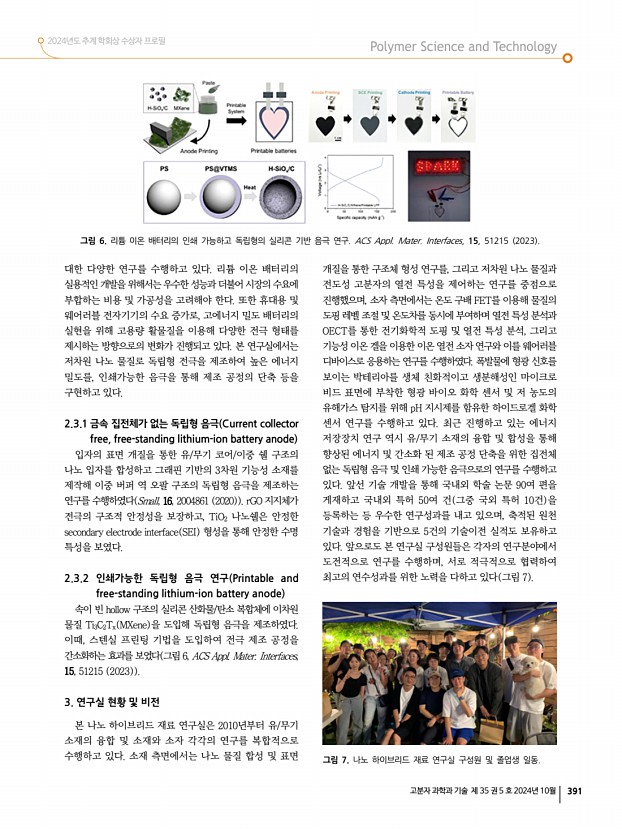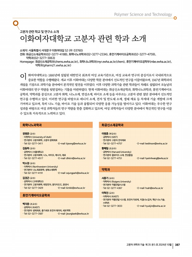 고분자 과학과 기술 제 35 권 5 호 2024년 10월 387 고분자 관련 학교 및 연구소 소개 이화여자대학교 고분자 관련 학과 소개 소재지서울특별시 서대문구 이화여대길 52 우03760 전화화공신소재공학과 02-3277-4188 , 화학나노과학과 02-3277-2334 , 휴먼기계바이오공학과 02-3277-4759 , 약학과 02-3277-3063 Homepage화공신소재공학과 chems.ewha.ac.kr , 화학나노과학과 myr.ewha.ac.kr/chem , 휴먼기계바이오공학부 mbe.ewha.ac.kr , 약학과 pharm21.ewha.ac.kr 화여자대학교는 1886년에 설립된 대한민국 최초의 여성 교육기관으로, 여성 교육과 연구의 중심지로서 국내외적으로 중요한 역할을 수행해왔다. 개교 이후 이화여대는 다양한 학문 분야에서 선도적인 연구를 이끌어왔으며, 1947년 화학과의 개설을 기점으로 과학기술 분야에서 본격적인 발전을 이루었다. 이후 다양한 과학기술 관련 학과들...