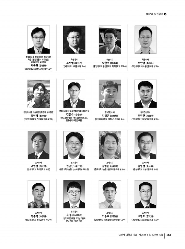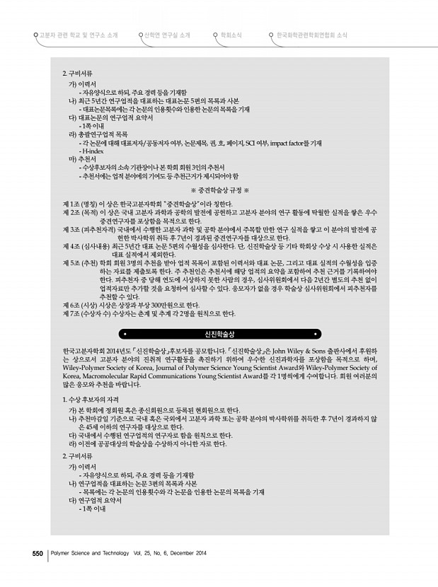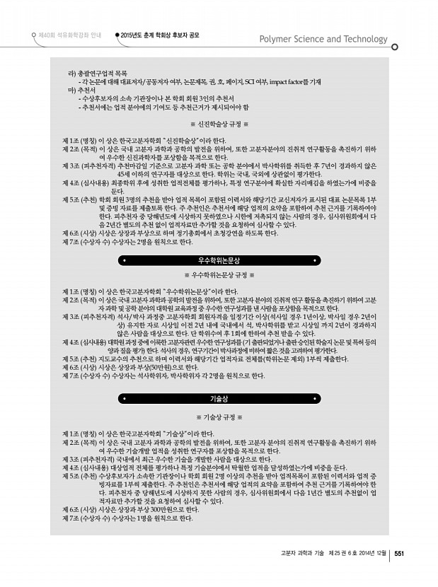제40회 석유화학강좌 안내 2015년도 춘계 학회상 후보자 공모 고분자 과학과 기술 제 25 권 6 호 2014년 12월 551 라 총괄연구업적 목록 각 논문에 대해 대표저자/공동저자 여부, 논문제목, 권, 호, 페이지, SCI 여부, impact factor를 기재 마 추천서 수상후보자의 소속 기관장이나 본 학회 회원 3인의 추천서 추천서에는 업적 분야에의 기여도 등 추천근거가 제시되어야 함 ※ 신진학술상 규정 ※ 제 1조 명칭 이 상은 한국고분자학회 “신진학술상”이라 한다. 제 2조 목적 이 상은 국내 고분자 과학과 공학의 발전을 위하여, 또한 고분자분야의 진취적 연구활동을 촉진하기 위하 여 우수한 신진과학자를 포상함을 목적으로 한다. 제 3조 피추천자격 추천마감일 기준으로 고분자 과학 또는 공학 분야에서 박사학위를 취득한 후 7년이 경과하지 않은 45세 이하의 연구자를...