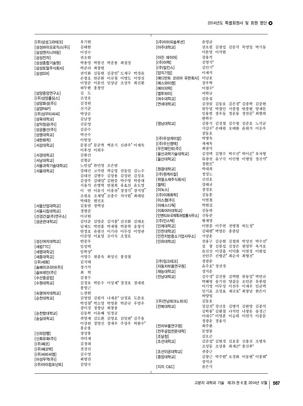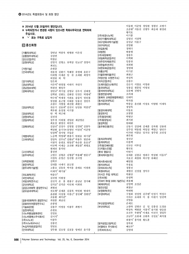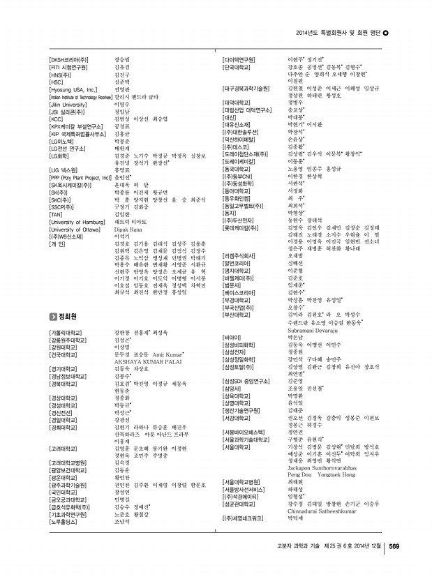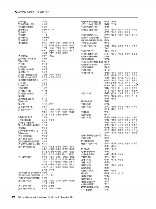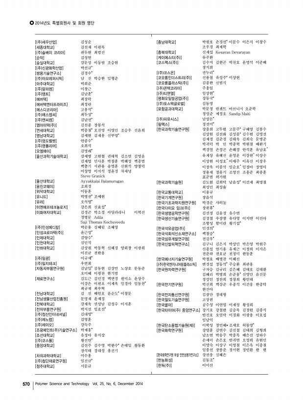 2014년도 특별회원사 및 회원 명단 고분자 과학과 기술 제 25 권 6 호 2014년 12월 569 [DKSH코리아 주 ] 장승필 [FITI 시험연구원] 김유겸 [HNS 주 ] 김진구 [HSC] 심준택 [Hyosung USA, Inc.] 전영관 [Indian Institute of Technology Roorkee] 칼리시 챈드라 굽타 [Jilin University] 이명수 [JSI 실리콘 주 ] 정일남 [KCC] 김범성 이상선 최승엽 [KPX케미칼 부설연구소] 공경표 [KIP 국제특허법률사무소] 김홍균 [LG이노텍] 박봉준 [LG전선 연구소] 배헌재 [LG화학] 김경준 노기수 박정규 박정옥 심창보 유진녕 장석기 한장선* [LIG 넥스원] 홍명표 [PPP Poly Plant Project, Inc ] 윤인선* [SK옥시케미칼 주 ] 윤대욱 허 달 [SK 주 ] 박종률 이건채 황규면 [SKC 주 ] 박 훈 양지현 양창선 윤 숭 최준식 [SSCP 주 ] 구정기 김화중 [TAN] 김일한 [University of Hamburg] 패트릭 티아토 [University of Ottawa] Dipak Rana [ 주 WB신소재] 이석기 [...
