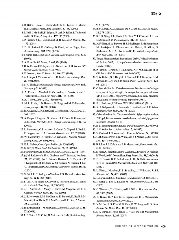 이유한 고분자 과학과 기술 제 25 권 5 호 2014년 10월 409 7. R. Bitton, E. Josef, I. Shimshelashvili, K. Shapira, D. Seliktar, and H. Bianco-Peled, Acta Biomater., 5, 1582 2009 8. S. Kull, I. Martinelli, E. Briganti, P. Losi, D. Spiller, S. Tonlorenzi, and G. Soldani, J. Surg. Res., 157, e15 2009 9. P. Ferreira, J. F. J. Coelho, and M. H. Gil, Int. J. Pharm., 352, 172 2008 10. D. M. Toriumi, K. O’Grady, D. Desai, and A. Bagal, Plast Reconstr. Surg., 102, 2209 1998 11. Frauma TechologyInt. J. Trauma. Nurs/Trauma Tech., 5, 29 1999 12. A. E. Ardis, US Patent, 2, 467,926 1949 13. H. W. Coover, F. B. Joyner, N. H. Shearer, and T. H. Wicker, SPE Special Tech Papers., 5, 413 1959 14. F. Leonard, Ann. N. YAcad. Sci, 146, 203 1968 15. A. J. Singer, J. V. Quinn, and J. E. Hollander, Am. J. Emerg. Med., 26, 490 2008 16. S. K. Bhatia, Biomaterials for clinical applications., New York, Springer, p.213 2010 17. A. Chow, H. Marshall E. Zacharakis, P. Paraskeva, and S. Purkayastha, J. ...