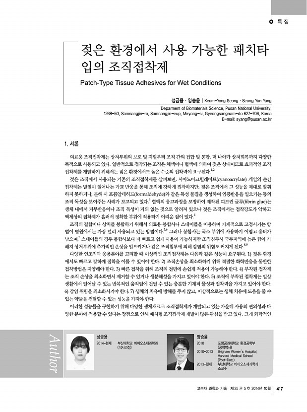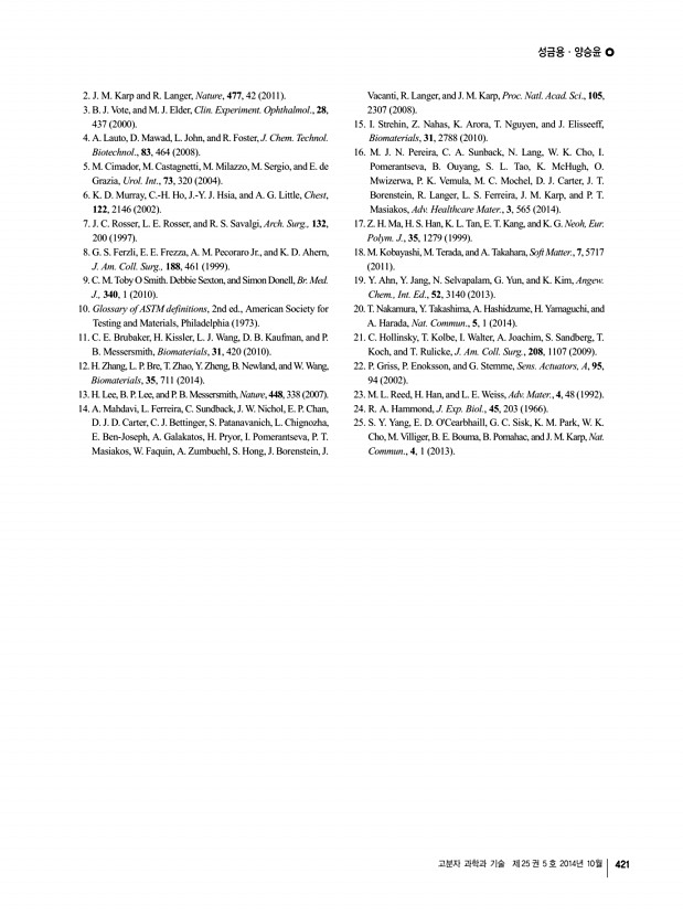 성금용ㆍ양승윤 고분자 과학과 기술 제 25 권 5 호 2014년 10월 421 2. J. M. Karp and R. Langer, Nature, 477, 42 2011 3. B. J. Vote, and M. J. Elder, Clin. Experiment. Ophthalmol., 28, 437 2000 4. A. Lauto, D. Mawad, L. John, and R. Foster, J. Chem. Technol. Biotechnol., 83, 464 2008 5. M. Cimador, M. Castagnetti, M. Milazzo, M. Sergio, and E. de Grazia, Urol. Int., 73, 320 2004 6. K. D. Murray, C.-H. Ho, J.-Y. J. Hsia, and A. G. Little, Chest, 122, 2146 2002 7. J. C. Rosser, L. E. Rosser, and R. S. Savalgi, Arch. Surg., 132, 200 1997 8. G. S. Ferzli, E. E. Frezza, A. M. Pecoraro Jr., and K. D. Ahern, J. Am. Coll. Surg., 188, 461 1999 9. C. M. Toby O Smith. Debbie Sexton, and Simon Donell, Br. Med. J., 340, 1 2010 10. Glossary of ASTM definitions, 2nd ed., American Society for Testing and Materials, Philadelphia 1973 11. C. E. Brubaker, H. Kissler, L. J. Wang, D. B. Kaufman, and P. B. Messersmith, Biomaterials, 31, 420 2010 12. H. Zhang, L. P. Bre, T. Zhao, Y. Zheng, B....