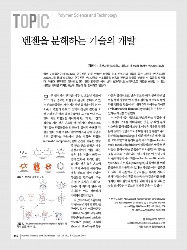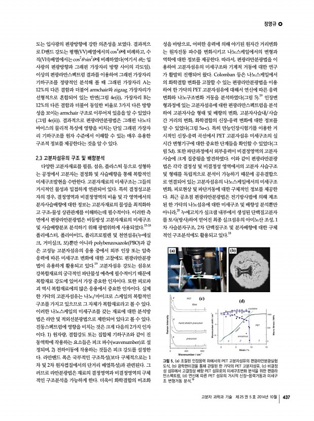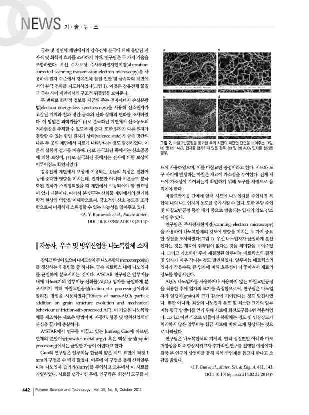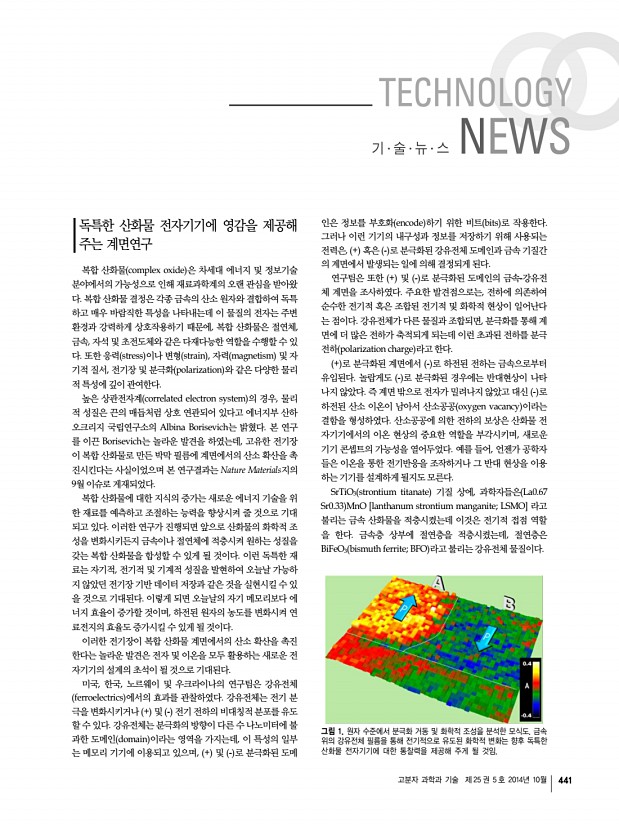 고분자 과학과 기술 제 25 권 5 호 2014년 10월 441 그림 1. 원자 수준에서 분극화 거동 및 화학적 조성을 분석한 모식도. 금속 위의 강유전체 필름을 통해 전기적으로 유도된 화학적 변화는 향후 독특한 산화물 전자기기에 대한 통찰력을 제공해 주게 될 것임. 독특한 산화물 전자기기에 영감을 제공해 주는계면연구 복합 산화물 complex oxide 은 차세대 에너지 및 정보기술 분야에서의 가능성으로 인해 재료과학계의 오랜 관심을 받아왔 다. 복합 산화물 결정은 각종 금속의 산소 원자와 결합하여 독특 하고 매우 바람직한 특성을 나타내는데 이 물질의 전자는 주변 환경과 강력하게 상호작용하기 때문에, 복합 산화물은 절연체, 금속, 자석 및 초전도체와 같은 다재다능한 역할을 수행할 수 있 다. 또한 응력 stress 이나 변형 strain , 자력 magnetism 및 자 기적 질서, 전...