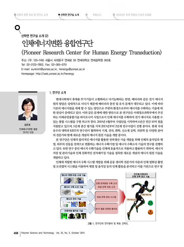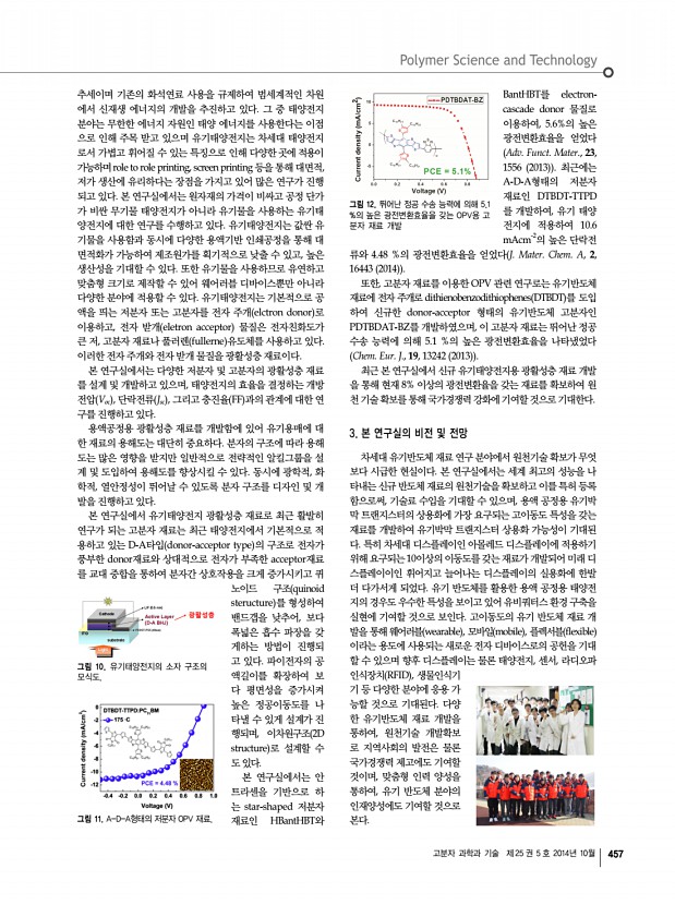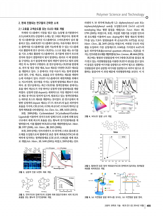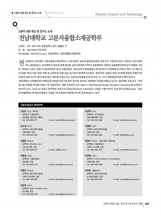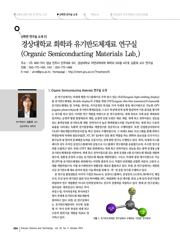 ... 2014년도 추계 학회상 수상자 프로필 산학연 연구실 소개 학회소식 454 Polymer Science and Technology Vol. 25, No. 5, October 2014 연구책임자l김윤희 교수 경상대학교 화학과 그림 1. 유기반도체재료 연구실에서 수행하는 다양한 연구분야 산학연 연구실 소개 1 경상대학교 화학과 유기반도체재료 연구실 Organic Semiconducting Materials Lab. 주소 우660-701 경남 진주시 진주대로 501, 경상대학교 자연과학대학 화학과 352동 427호 김윤희 교수 연구실 전화 055-772-1491, FAX 055-772-1489 E-mail ykim@gnu.ac.kr, Homepage http//chem.gnu.ac.kr/?mod=pro10 1. Organic Semiconducting Materials 연구실 소개 본 연구실에서는 차세대 평판 디스플레이로 주목 받고 있는 OLED organic light emitting display 용 유기반도체재료, flexible display의 구현을 위한 OTFT organic thin film transistor 의 channel용 유기반도체재료 및 가벼움, 휘어짐, 저...