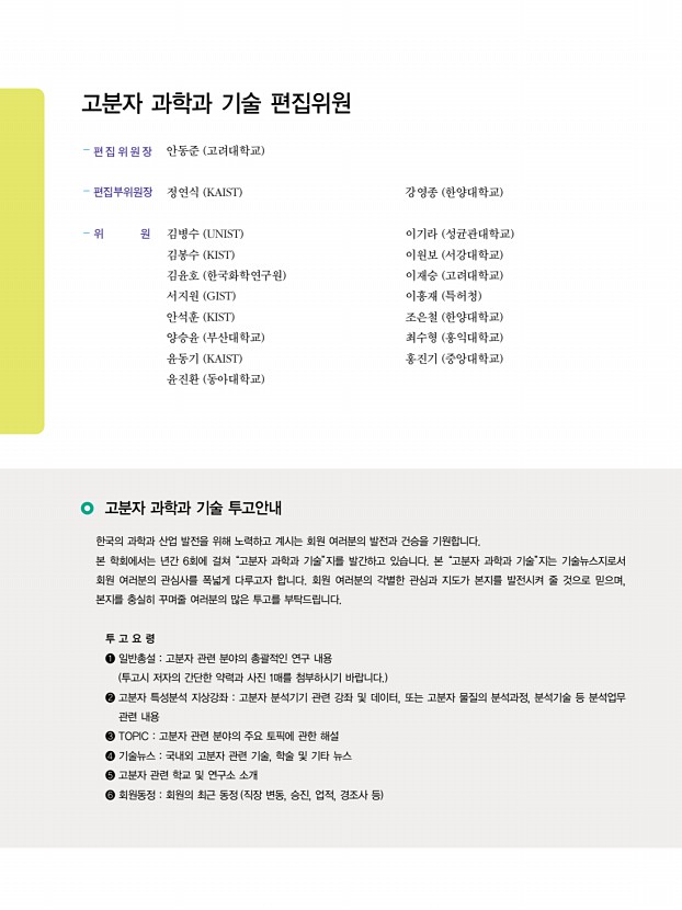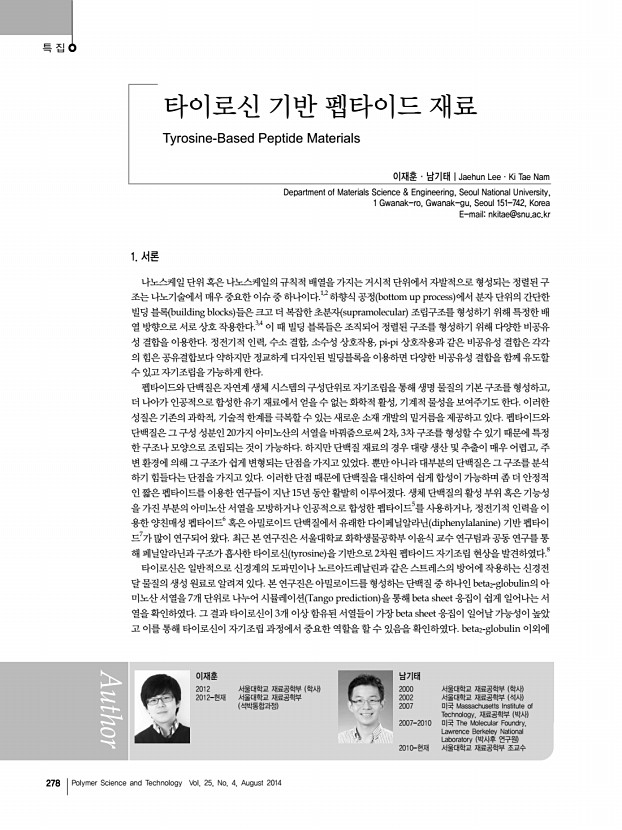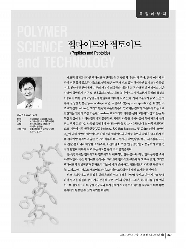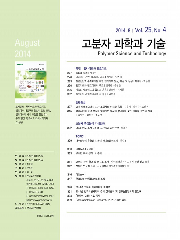 표지설명 펩타이드와 펩토이드, 펩토이드 나선구조 형성과 접힙 조절, 펩토이드의 자기 조립을 통한 3차 구조 형성, 펩토이드 라이브러리와 그 응용 August 2014 2014. 8|Vol. 25, No. 4 고분자 과학과 기술 Polymer Science and Technology 277 278 283 290 296 302 307 315 322 329 330 333 341 342 346 347 348 351 398 399 인 쇄 일 | 2014년 8월 20일 발 행 일 | 2014년 8월 25일 발 행 인 | 허수영 편 집 인 | 안동준 인 쇄 인 | 이 숙 발 행 처 | 한국고분자학회 서울시 강남구 강남대로 354 혜천빌딩 601호 우135-792 T. 02 568-3860, 561-5203 F. 02 553-6938 E. polymer@polymer.or.kr http//www.polymer.or.kr 디 자 인 | 동양기획 02 2272-6826 표지디자인 | 한국고분자학회 판매가 5,000원 특집 펩타이드와 펩토이드 특집에 부쳐|서지원 타이로신 기반 펩타이드 재료|이재훈·남기태 질병진단과 분자표적을 위한 펩타이드 발굴, 개량 및 ...