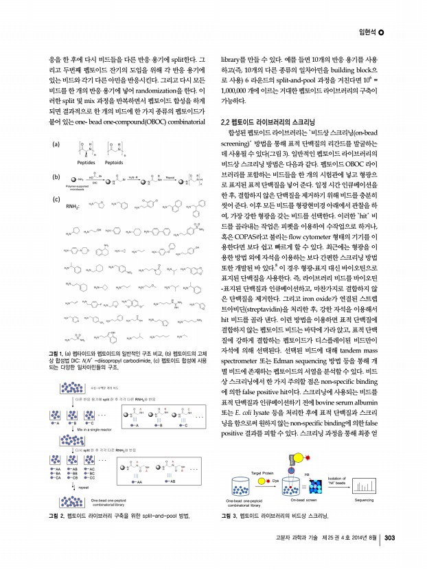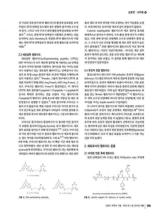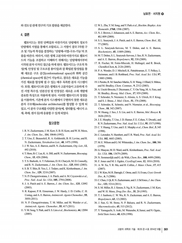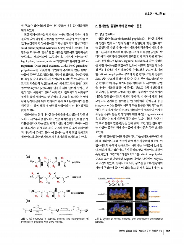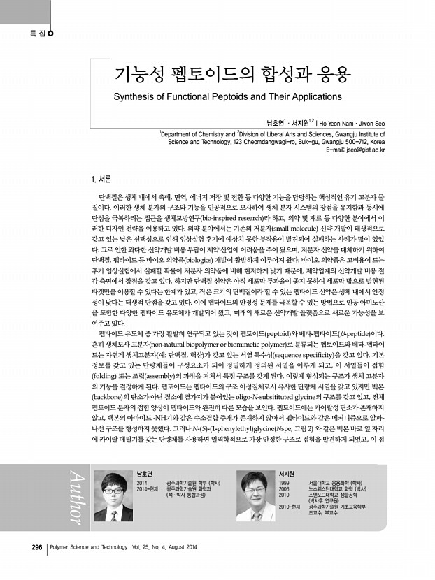 특 집 296 Polymer Science and Technology Vol. 25, No. 4, August 2014 기능성 펩토이드의 합성과 응용 Synthesis of Functional Peptoids and Their Applications 남호연1ㆍ서지원1,2 | Ho Yeon NamㆍJiwon Seo 1 Department of Chemistry and 2Division of Liberal Arts and Sciences, Gwangju Institute of Science and Technology, 123 Cheomdangwagi-ro, Buk-gu, Gwangju 500-712, Korea E-mailjseo@gist.ac.kr 남호연 2014 광주과학기술원 학부 학사 2014-현재 광주과학기술원 화학과 석·박사 통합과정 서지원 1999 서울대학교 응용화학 학사 2006 노스웨스턴대학교 화학 박사 2010 스탠포드대학교 생물공학 박사후 연구원 2010-현재 광주과학기술원 기초교육학부 조교수, 부교수 1. 서론 단백질은 생체 내에서 촉매, 면역, 에너지 저장 및 전환 등 다양한 기능을 담당하는 핵심적인 유기 고분자 물 질이다. 이러한 생체 분자의 구조와 기능을 인공적으로 모사하...