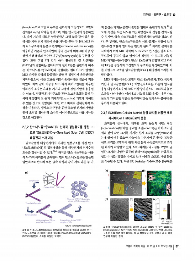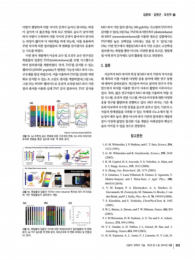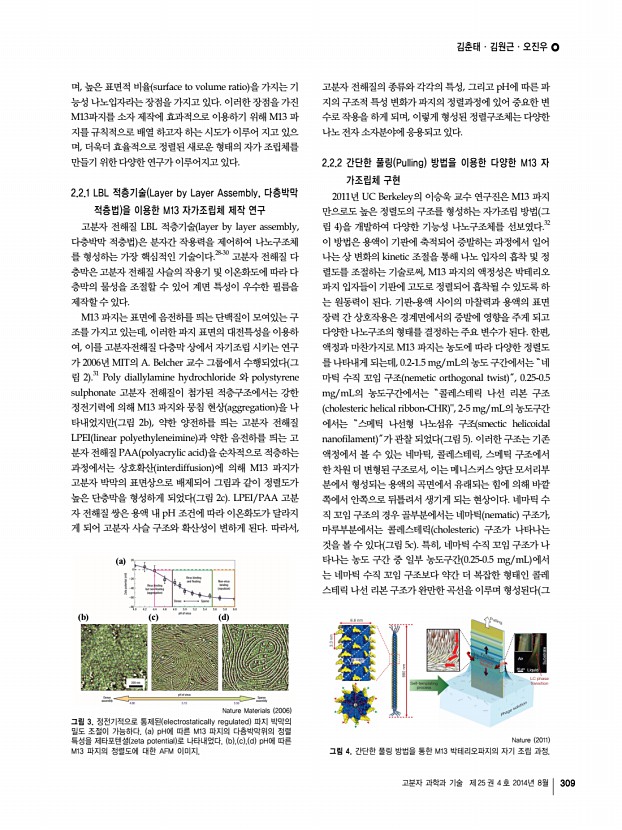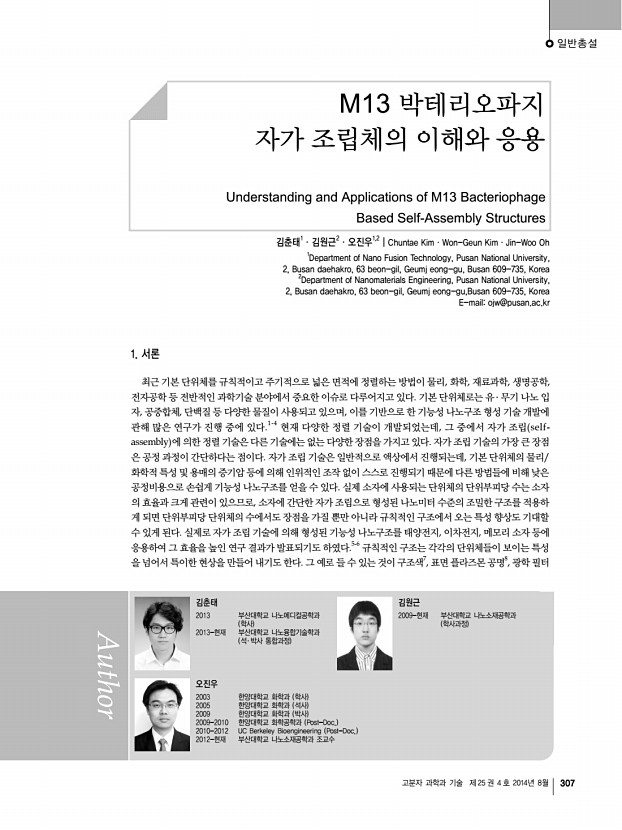 일반총설 고분자 과학과 기술 제 25 권 4 호 2014년 8월 307 김춘태 2013 부산대학교 나노메디컬공학과 학사 2013-현재 부산대학교 나노융합기술학과 석 ․ 박사 통합과정 김원근 2009-현재 부산대학교 나노소재공학과 학사과정 오진우 2003 한양대학교 화학과 학사 2005 한양대학교 화학과 석사 2009 한양대학교 화학과 박사 2009-2010 한양대학교 화학공학과 Post-Doc. 2010-2012 UC Berkeley Bioengineering Post-Doc. 2012-현재 부산대학교 나노소재공학과 조교수 M13 박테리오파지 자가 조립체의 이해와 응용 Understanding and Applications of M13 Bacteriophage Based Self-Assembly Structures 김춘태1ㆍ김원근2ㆍ오진우1,2 | Chuntae KimㆍWon-Geun KimㆍJin-Woo Oh 1 Department of Nano Fusion Technology, Pusan National University, 2, Busan daehakro, 63 beon-gil, Geumj eong-gu, Busan 609-735, Korea 2 Department of Nanomaterials Engineering, Pusan National Universit...