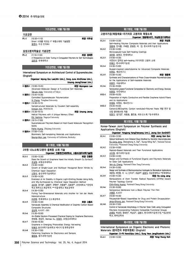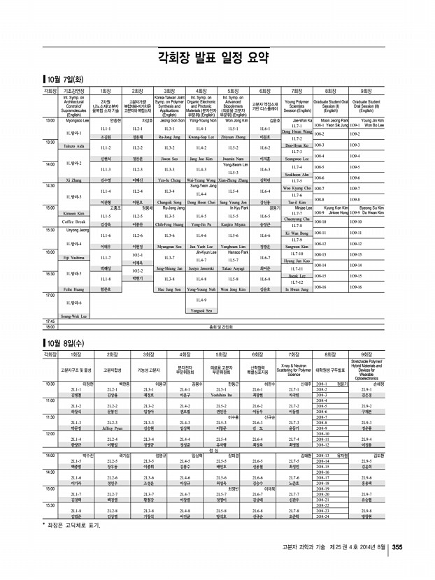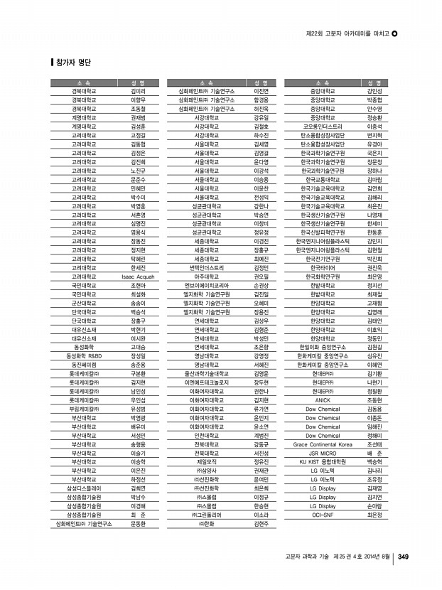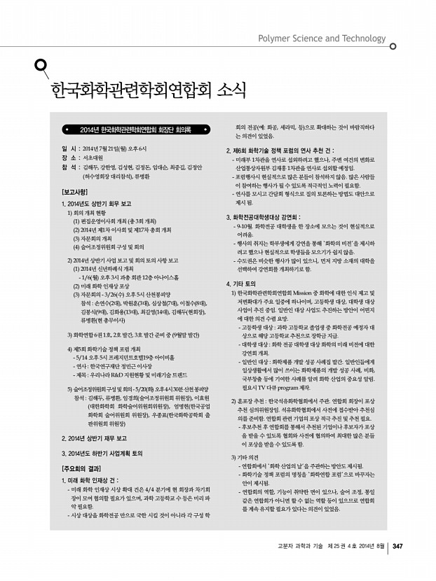고분자 과학과 기술 제 25 권 4 호 2014년 8월 347 한국화학관련학회연합회 소식 2014년 한국화학관련학회연합회 회장단 회의록 일 시 2014년 7월 21일 월 오후 6시 장 소 서초대원 참 석 김해두, 강한영, 김성현, 김정돈, 임대순, 최중길, 김정안 허수영회장 대리참석 , 류병환 [보고사항] 1. 2014년도 상반기 회무 보고 1 회의 개최 현황 1 편집운영이사회 개최 총 3회 개최 2 2014년 제1차 이사회 및 제17차 총회 개최 3 자문회의 개최 4 술어조정위원회 구성 및 회의 2 2014년 상반기 사업 보고 및 회의 토의 사항 보고 1 2014년 신년하례식 개최 1/6 월 오후 3시 과총 회관 12층 아나이스홀 2 미래 화학 인재상 포상 3 자문회의 3/26 수 오후 5시 산천봉피양 참석 손연수 2대 , 박원훈 3대 , 심상철 7대 , 이철수 8대 , 김봉식 9대 , 김화용 13대 , 최길영 14대 , 김해두 현회장 , 류병환 현 ...