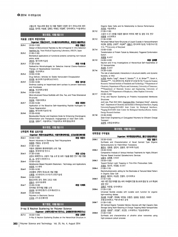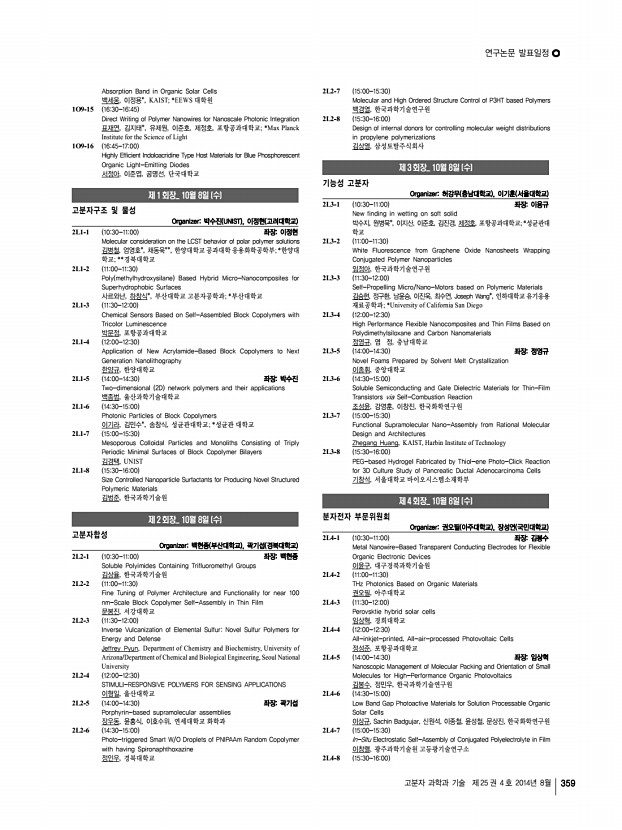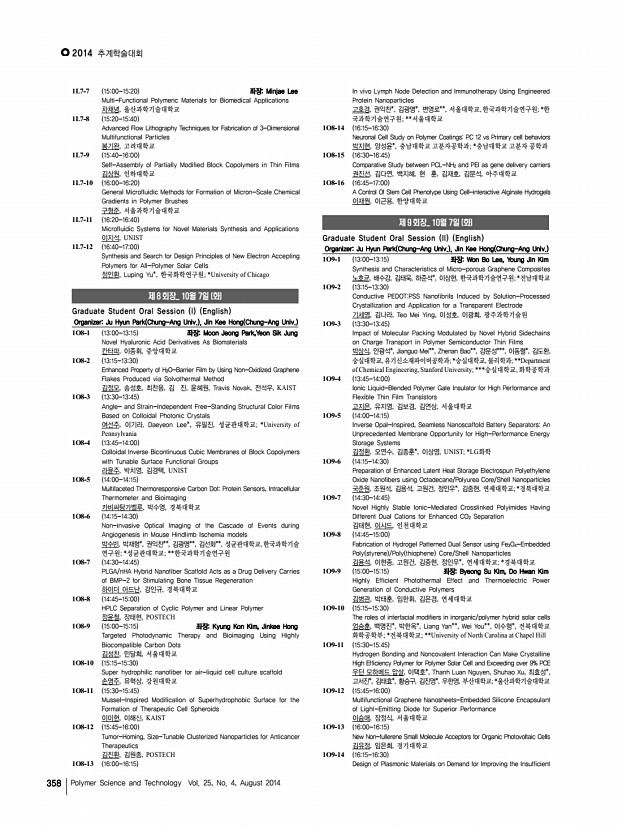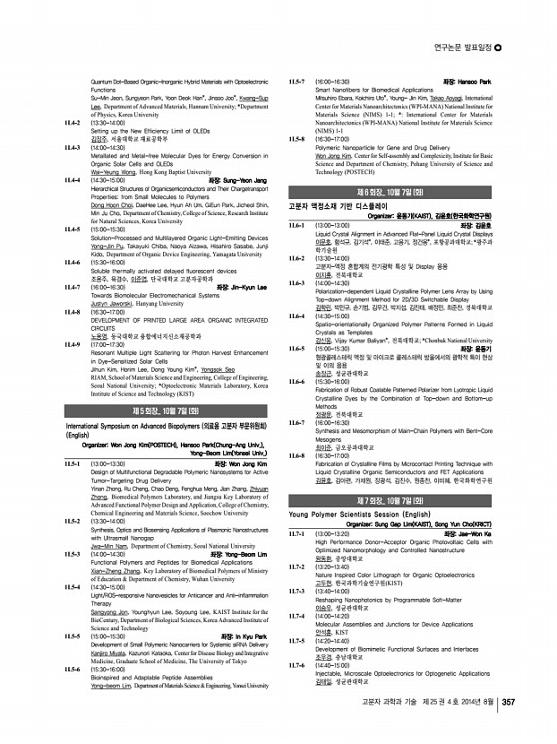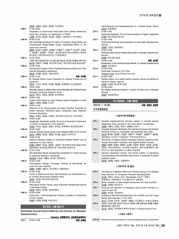 연구논문 발표일정 고분자 과학과 기술 제 25 권 4 호 2014년 8월 361 이은종, 김용회, 조현아, 김진열, 국민대학교 2O8-9 1150-1200 Preparation of Cross-linked Poly Arylene Ether Sulfone Membranes Using Click Chemistry for Applications in PEMFC 고태윤, 김기현, 정보경, 차상호*, 이종찬, 서울대학교; *경기대학교 2O8-10 1200-1210 Self-Assembled Monolayer Formation of Graphene Oxide Sheets and Functionalized Single-Walled Carbon Nanotubes f-SWNT at the Liquid-Gas Interface 김혜리, 강신현*, 최성민*, 장영래**, 유제승***, 서영수***, 김기연**, 이정수 **, 박순동**, 김찬중**, 구자승**, 한국원자력연구원/고려대학교; *한국과 학기술원; **한국원자력연구원; ***세종대학교 2O8-11 1210-1220 기계적 강도가 향상된 PES 나노섬유 필터 합성 및 공기중 미세입자 제거 연구 배지열, 김현아*, 최희철, 광주과학기술원; *광주과학기술원 환경공학부 2...