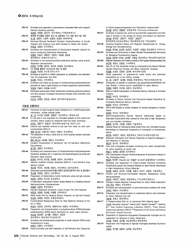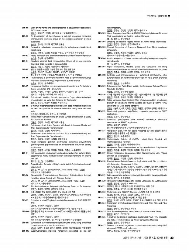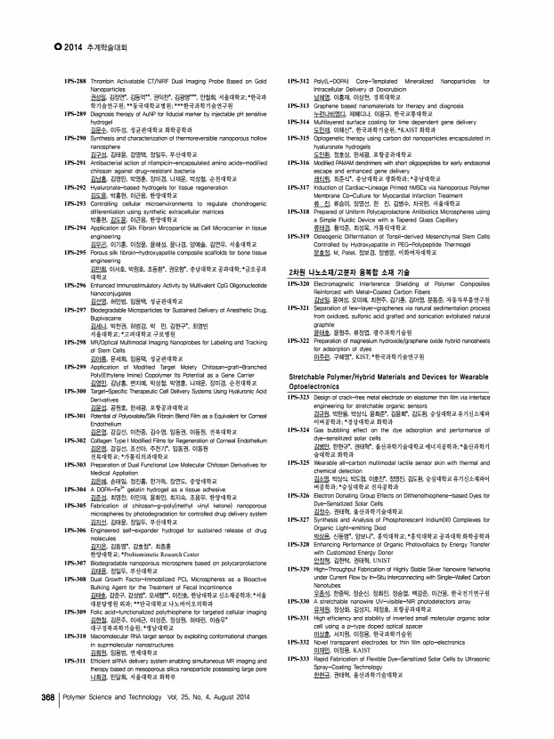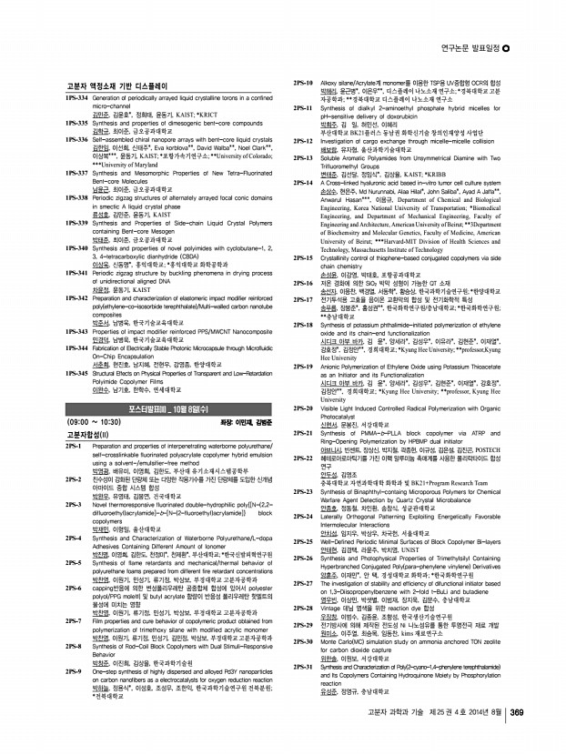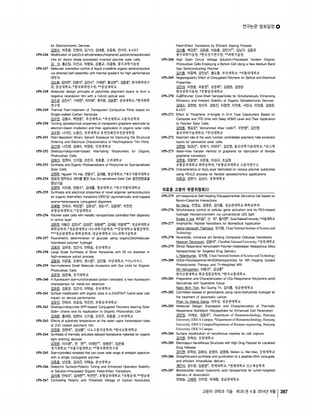 연구논문 발표일정 고분자 과학과 기술 제 25 권 4 호 2014년 8월 367 for Electrochromic Devices 김범수, 박준용, 안창의, 김기선, 김태훈, 조동휘, 전석우, KAIST 1PS-246 Modification of poly 3,4-ethylenedioxythiophene poly styrenesulfonate inks for doctor blade processed inverted polymer solar cells 김 석, 홍순일, 이선규, 박병욱, 강홍규, 이광희, 광주과학기술원 1PS-247 Molecular orientation control of liquid crystalline organic semiconductors via directed self-assembly with thermal gradient for high performance OFETs 김소희, 김아련*, 장광석*, 김진수*, 가재원*, 홍성권**, 김윤호*, 한국화학연구 원, 충남대학교; *한국화학연구원; **충남대학교 1PS-248 Molecular design principle of polyimide alignment layers to form a negative retardation film with a hybrid optical axis 김수경, 김진수*, 가재원*, 이미혜*, 류주환, 김윤호*, 충남대학교; *한국화학 연구원 1PS-249 Therm...