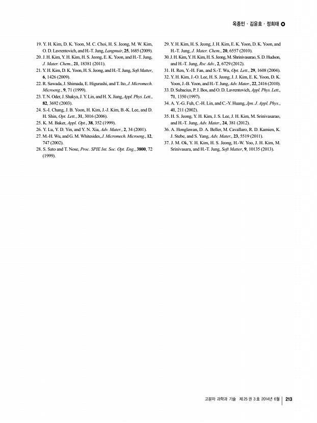 옥종민ㆍ김윤호ㆍ정희태 고분자 과학과 기술 제 25 권 3 호 2014년 6월 213 19. Y. H. Kim, D. K. Yoon, M. C. Choi, H. S. Jeong, M. W. Kim, O. D. Lavrentovich, and H.-T. Jung, Langmuir, 25, 1685 2009 20. J. H. Kim, Y. H. Kim, H. S. Jeong, E. K. Yoon, and H.-T. Jung, J. Mater. Chem., 21, 18381 2011 21. Y. H. Kim, D. K. Yoon, H. S. Jeong, and H.-T. Jung, Soft Matter, 6, 1426 2009 22. R. Sawada, J. Shimada, E. Higurashi, and T. Ito, J. Micromech. Microeng., 9, 71 1999 23. T. N. Oder, J. Shakya, J. Y. Lin, and H. X. Jiang, Appl. Phys. Lett., 82, 3692 2003 24. S.-I. Chang, J. B. Yoon, H. Kim, J.-J. Kim, B.-K. Lee, and D. H. Shin, Opt. Lett., 31, 3016 2006 25. K. M. Baker, Appl. Opt., 38, 352 1999 26. Y. Lu, Y. D. Yin, and Y. N. Xia, Adv. Mater., 2, 34 2001 27. M.-H. Wu, and G. M. Whitesides, J. Micromech. Microeng., 12, 747 2002 28. S. Sato and T. Nose, Proc. SPIE Int. Soc. Opt. Eng., 3800, 72 1999 29. Y. H. Kim, H. S. Jeong, J. H. Kim, E. K. Yoon, D. K. Yoon, and H.-T. Ju...