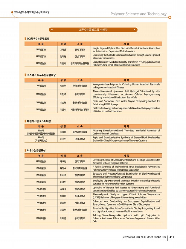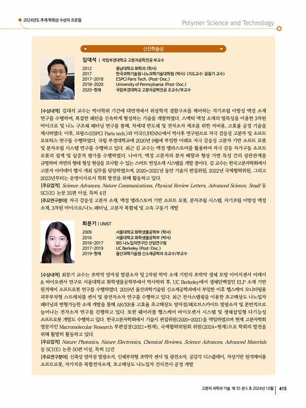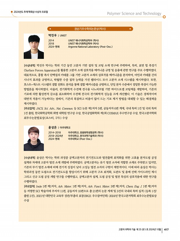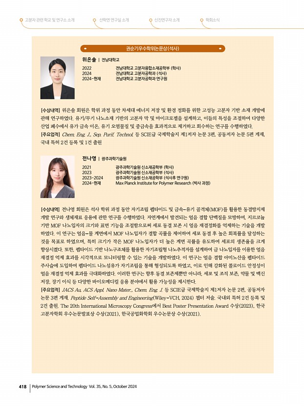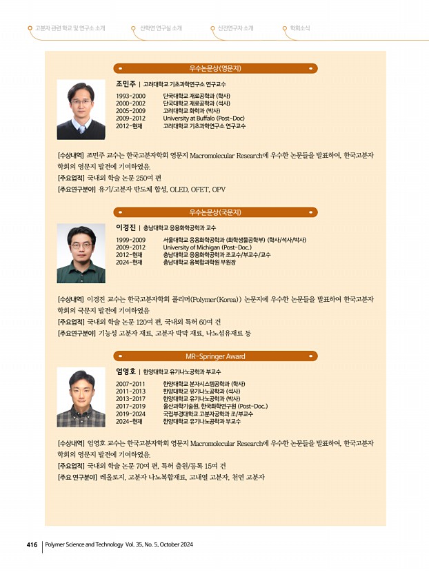 고분자 관련 학교 및 연구소 소개 산학연 연구실 소개 신진연구자 소개 학회소식 416 Polymer Science and Technology Vol. 35, No. 5, October 2024 우수논문상 영문지 조민주 | 고려대학교 기초과학연구소 연구교수 1993-2000 단국대학교 재료공학과 학사 2000-2002 단국대학교 재료공학과 석사 2005-2009 고려대학교 화학과 박사 2009-2012 University at Buffalo Post-Doc 2012-현재 고려대학교 기초과학연구소 연구교수 [수상내역] 조민주 교수는 한국고분자학회 영문지 Macromolecular Research에 우수한 논문들을 발표하여, 한국고분자 학회의 영문지 발전에 기여하였음. [주요업적] 국내외 학술 논문 250여 편 [주요연구분야] 유기/고분자 반도체 합성, OLED, OFET, OPV 우수논문상 국문지 이경진 | 충남대학교 응용화학공학과 교수 1999-2009 서울대학교 응용화학공학과 화학생물공학부 학사/석사/박사 ...