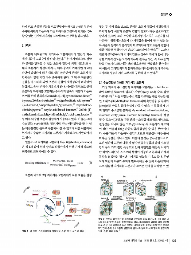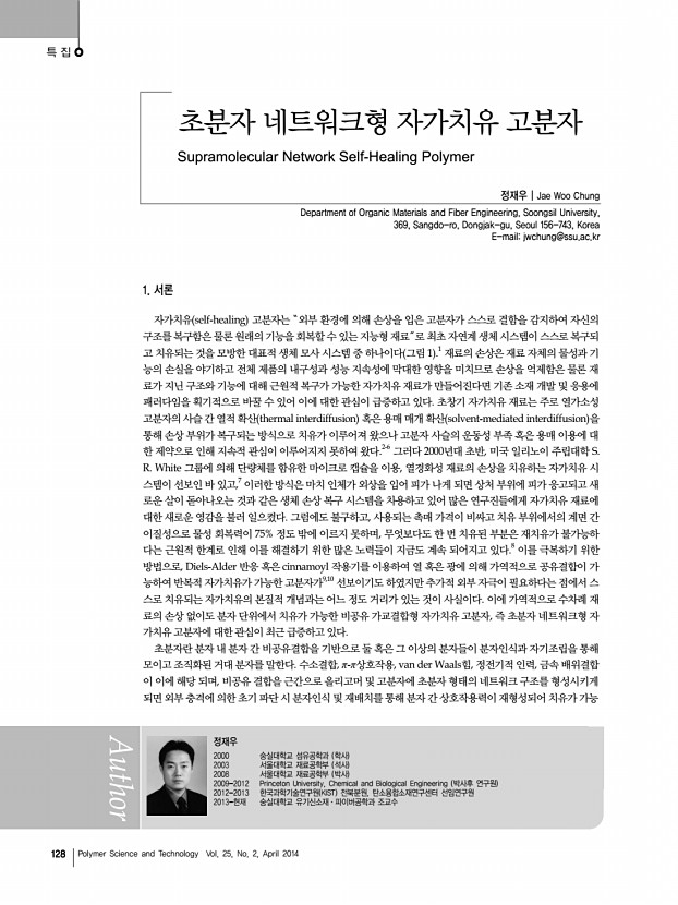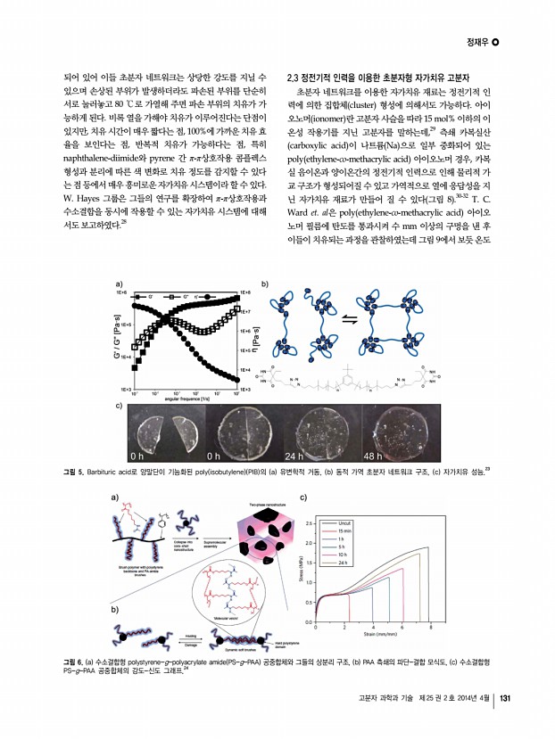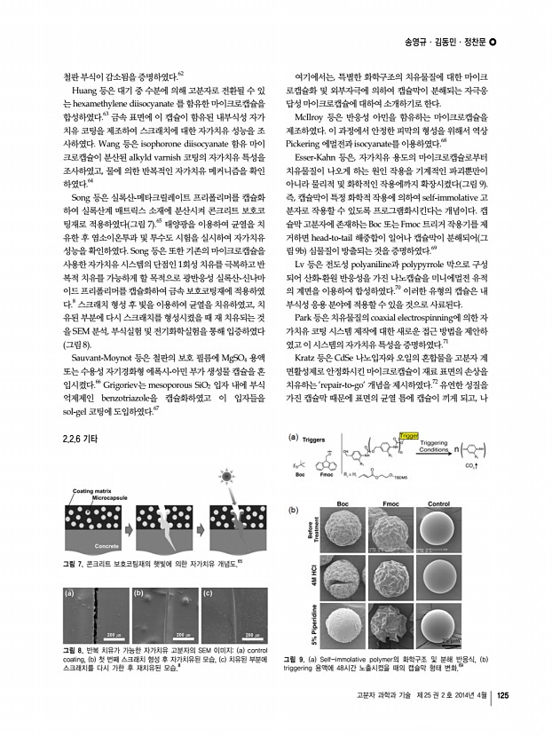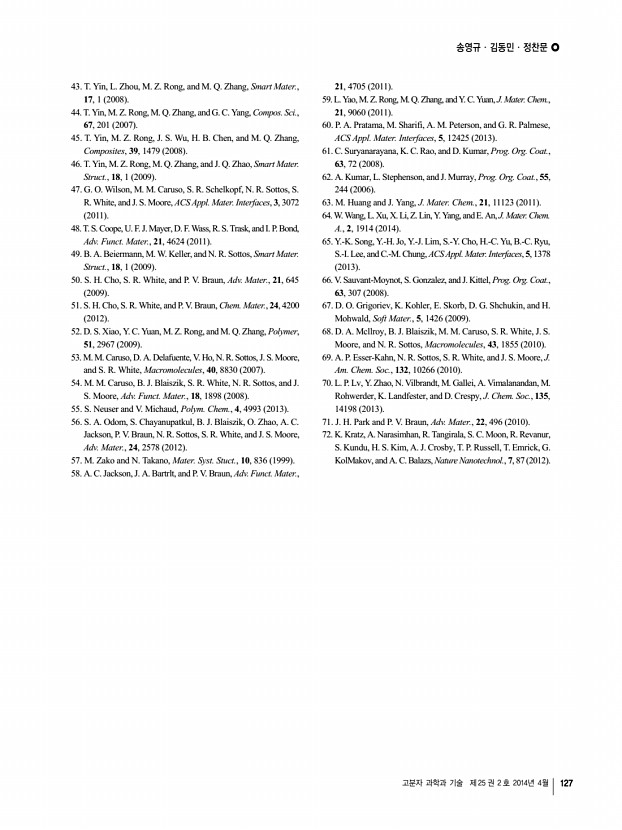 송영규ㆍ김동민ㆍ정찬문 고분자 과학과 기술 제 25 권 2 호 2014년 4월 127 43. T. Yin, L. Zhou, M. Z. Rong, and M. Q. Zhang, Smart Mater., 17, 1 2008 44. T. Yin, M. Z. Rong, M. Q. Zhang, and G. C. Yang, Compos. Sci., 67, 201 2007 45. T. Yin, M. Z. Rong, J. S. Wu, H. B. Chen, and M. Q. Zhang, Composites, 39, 1479 2008 46. T. Yin, M. Z. Rong, M. Q. Zhang, and J. Q. Zhao, Smart Mater. Struct., 18, 1 2009 47. G. O. Wilson, M. M. Caruso, S. R. Schelkopf, N. R. Sottos, S. R. White, and J. S. Moore, ACS Appl. Mater. Interfaces, 3, 3072 2011 48. T. S. Coope, U. F. J. Mayer, D. F. Wass, R. S. Trask, and I. P. Bond, Adv. Funct. Mater., 21, 4624 2011 49. B. A. Beiermann, M. W. Keller, and N. R. Sottos, Smart Mater. Struct., 18, 1 2009 50. S. H. Cho, S. R. White, and P. V. Braun, Adv. Mater., 21, 645 2009 51. S. H. Cho, S. R. White, and P. V. Braun, Chem. Mater., 24, 4200 2012 52. D. S. Xiao, Y. C. Yuan, M. Z. Rong, and M. Q. Zhang, Polymer, 51, 2967 2009 53. M. M. Caruso, D. A...