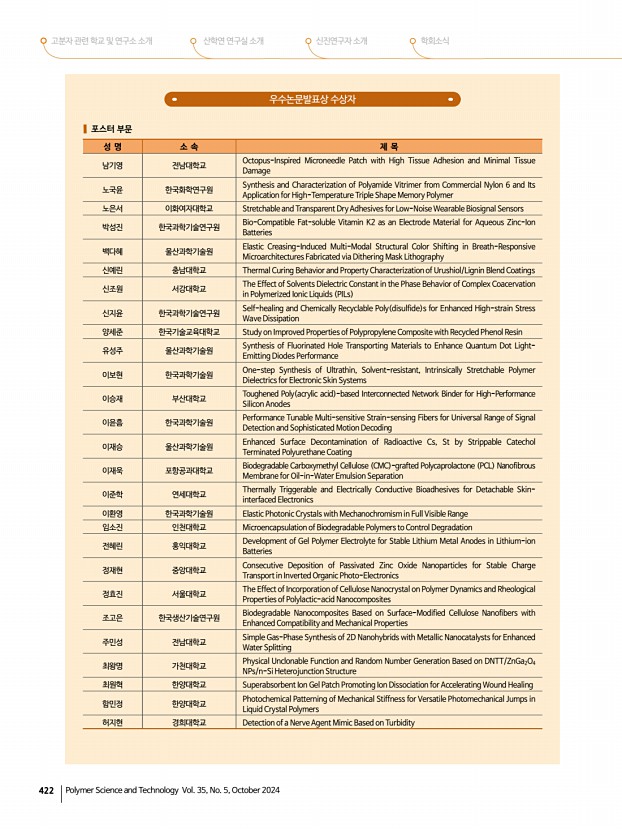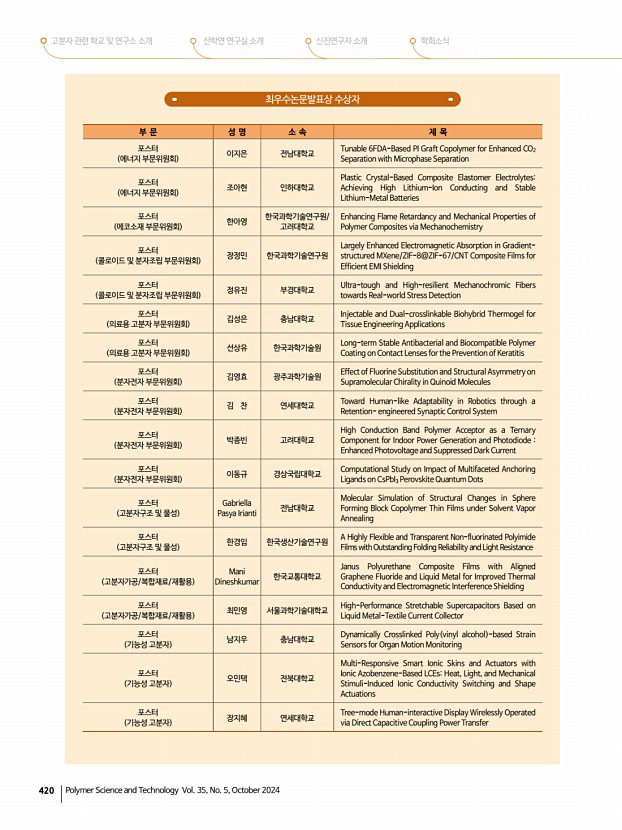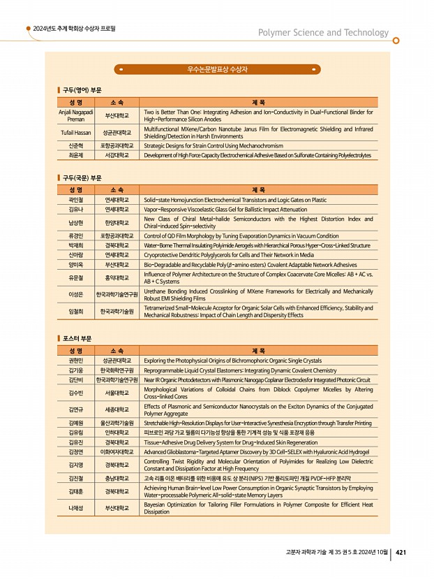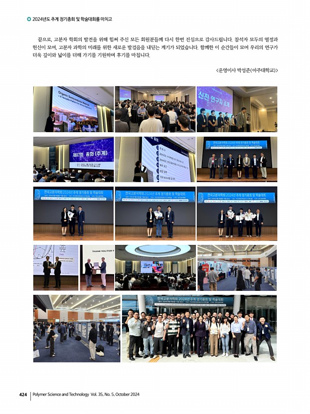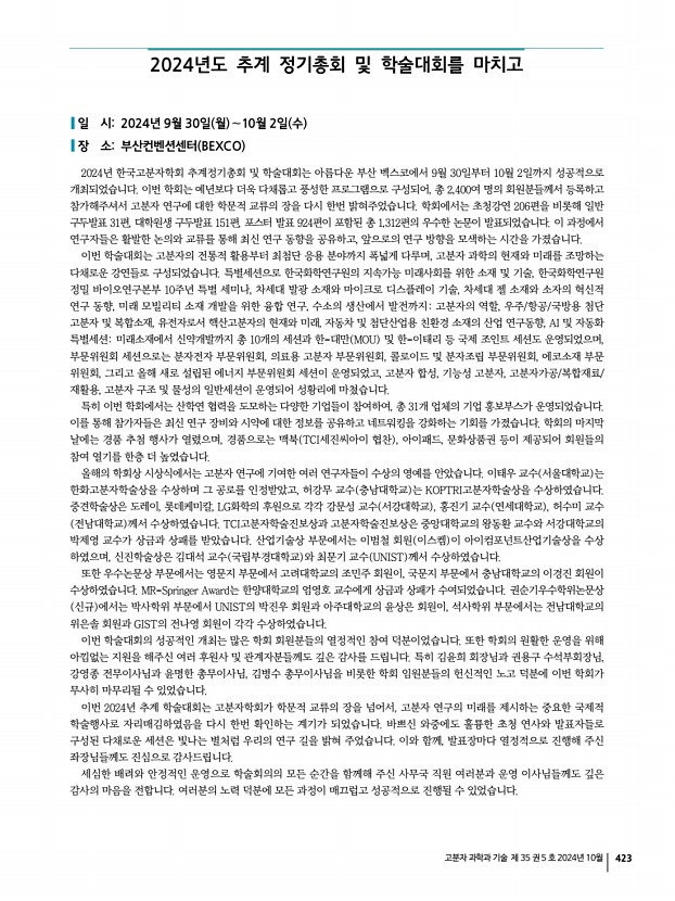 고분자 과학과 기술 제 35 권 5 호 2024년 10월 423 일 시2024년 9월 30일 월 ∼10월 2일 수 장 소부산컨벤션센터 BEXCO 2024년 한국고분자학회 추계정기총회 및 학술대회는 아름다운 부산 벡스코에서 9월 30일부터 10월 2일까지 성공적으로 개최되었습니다. 이번 학회는 예년보다 더욱 다채롭고 풍성한 프로그램으로 구성되어, 총 2,400여 명의 회원분들께서 등록하고 참가해주셔서 고분자 연구에 대한 학문적 교류의 장을 다시 한번 밝혀주었습니다. 학회에서는 초청강연 206편을 비롯해 일반 구두발표 31편, 대학원생 구두발표 151편, 포스터 발표 924편이 포함된 총 1,312편의 우수한 논문이 발표되었습니다. 이 과정에서 연구자들은 활발한 논의와 교류를 통해 최신 연구 동향을 공유하고, 앞으로의 연구 방향을 모색하는 시간을 가졌습니다. 이번 학술대회는 고분자의 ...