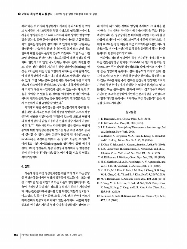 ... 동시 에 실시할 수 있다. 또한 고분자 물질의 영 계수 Youngs modulus 을 측정하는 데에도 본 장비가 이용될 수 있다.12 이외에도 시간 게이트 time-gated 영상처리, 공명 에너지 전이 FRET 영상분석, 형광 안정성의 통계처리 등 형광분광 분석 분야에서 다차원 시간, 공간, 에너지 등 신호 및 영상분 석이 가능하다. 4. 전망 시분해 형광 수명 영상현미경은 개발 초기 세포 또는 종양 등 생명과학 분야에서 형광의 정류상태 정보들 세기 또는 형 광 스펙트럼 등 을 기반으로 하는 기존의 형광현미경에서 관 측이 어려웠던 차별적인 정보를 분석하기 위하여 개발되었 다. 이는 관련분야에서 괄목할 만한 뚜렷한 학문적 진보를 보 이고 있으며, 최근에는 화학, 소재, 기계, 전자 분야에 이르기 까지 장비의 활용도가 확대되고 있는 추세이다. 시분해 형광 공초점 현미경은 ...