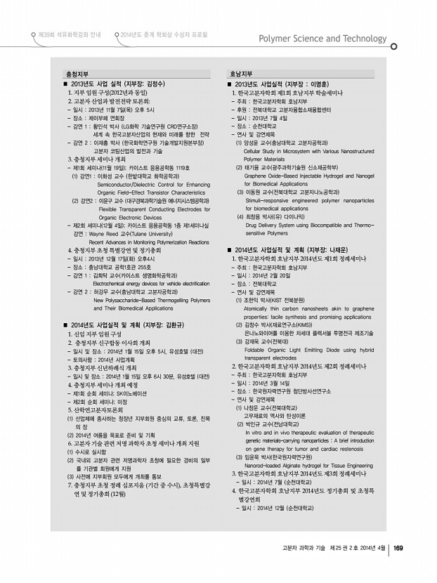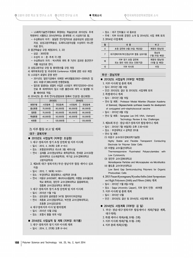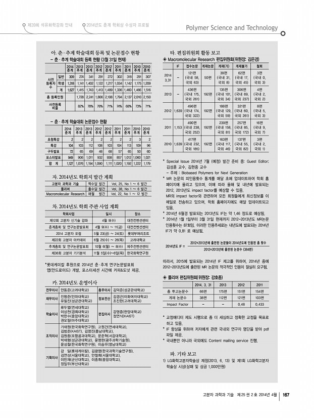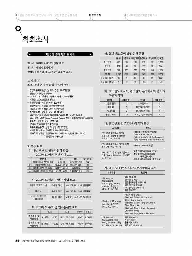... 2,150 사전등록 비율 82% 78% 78% 71% 74% 68% 73% 71% 춘 ․ 추계 학술대회 논문접수 현황 2014 춘계 2013 추계 2013 춘계 2012 추계 2012 춘계 2011 추계 2011 춘계 2010 추계 2010 춘계 초청특강 2 2 2 2 2 2 2 3 2 특강 104 103 112 108 103 104 113 109 96 구두발표 72 65 69 48 68 57 65 50 60 포스터발표 949 906 1,011 932 938 857 1,012 1,060 1,021 합 계 1,127 1,076 1,194 1,090 1,111 1,020 1,192 1,222 1,179 자. 2014년도 학회지 발간 계획 고분자 과학과 기술 짝수달 발간 Vol. 25, No 1 ∼ 6 발간 폴리머 홀수달 발간 Vol. 38, No 1 ∼ 6 발간 Macromolecular Research 매월 발간 Vol. 22, No 1 ∼ 12 발간 차. 2014년도 학회 주관 사업 계획 학회사업 일시 장소 제12회 고분자 신기술 강좌 4월 9 수 대전컨벤션센터 춘계총회 및 연구논문발표회 4월 9 수 11 금 대전컨벤션센터 2014 고분자 포럼 5월 23 금 24 토 롯데부여리조트 제22회 고분자 아카데미 6월 2...