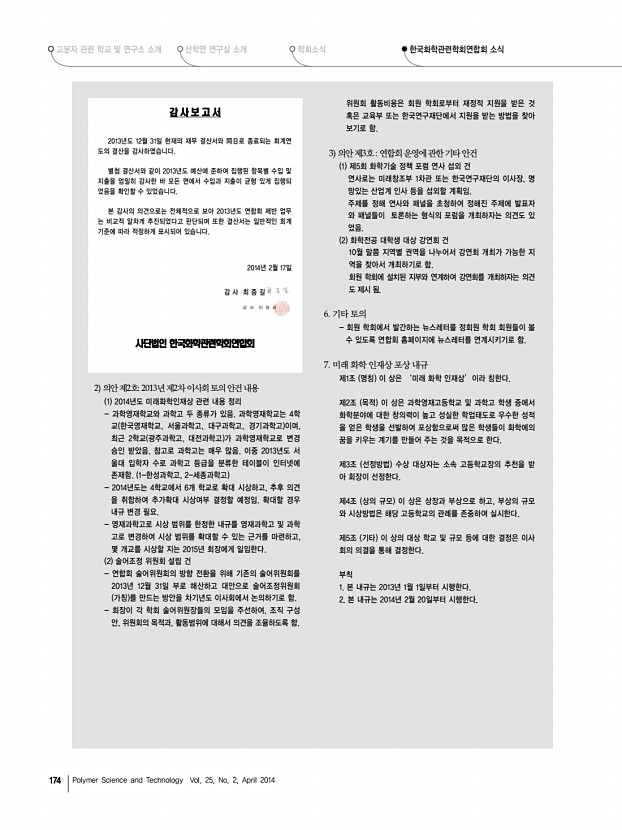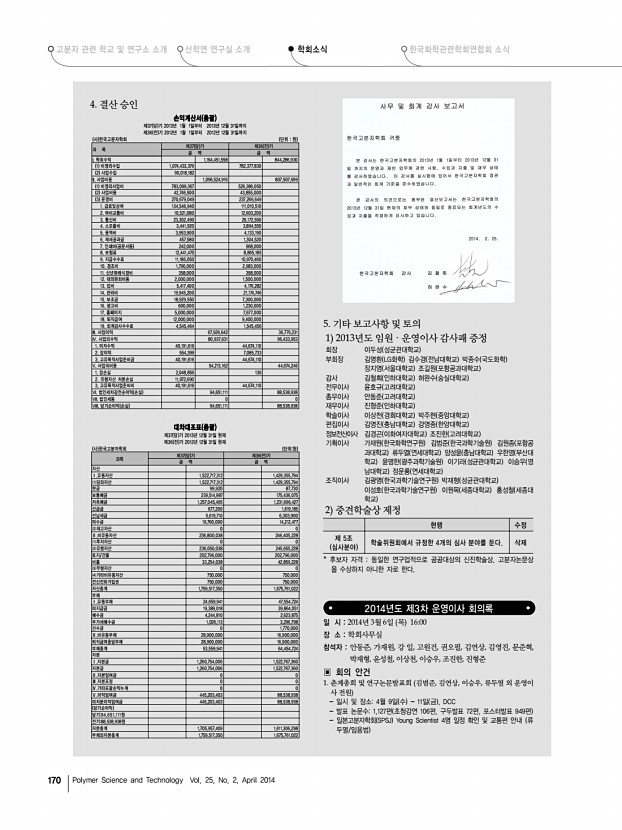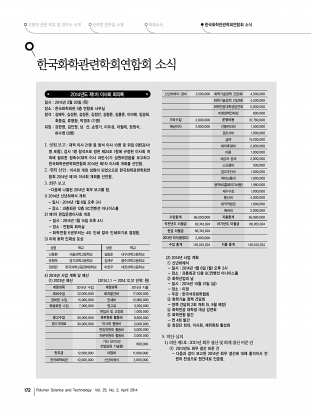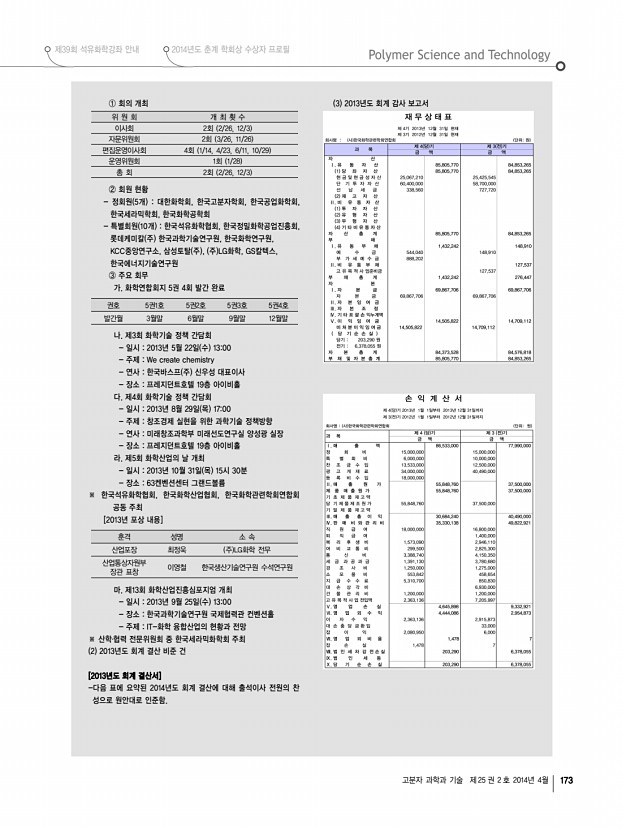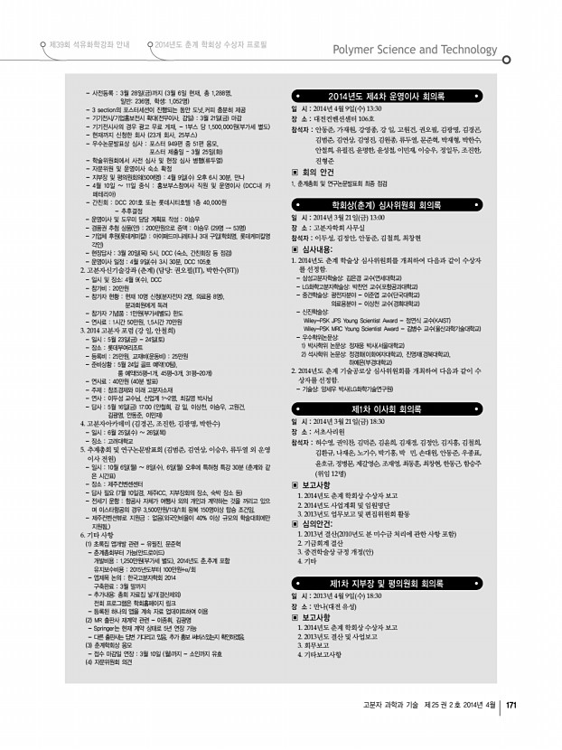 제39회 석유화학강좌 안내 2014년도 춘계 학회상 수상자 프로필 고분자 과학과 기술 제 25 권 2 호 2014년 4월 173 ① 회의 개최 위 원 회 개 최 횟 수 이사회 2회 2/26, 12/3 자문위원회 2회 3/26, 11/26 편집운영이사회 4회 1/14, 4/23, 6/11, 10/29 운영위원회 1회 1/28 총 회 2회 2/26, 12/3 ② 회원 현황 정회원 5개 대한화학회, 한국고분자학회, 한국공업화학회, 한국세라믹학회, 한국화학공학회 특별회원 10개 한국석유화학협회, 한국정밀화학공업진흥회, 롯데케미칼 주 한국과학기술연구원, 한국화학연구원, KCC중앙연구소, 삼성토탈 주 , 주 LG화학, GS칼텍스, 한국에너지기술연구원 ③ 주요 회무 가. 화학연합회지 5권 4회 발간 완료 권호 5권1호 5권2호 5권3호 5권4호 발간월 3월말 6월말 9월말 12월말 나. 제3회 화학기술 정책 간담회 일시 2013년 5월 22일 수 1300 주제 We create chemistry 연...