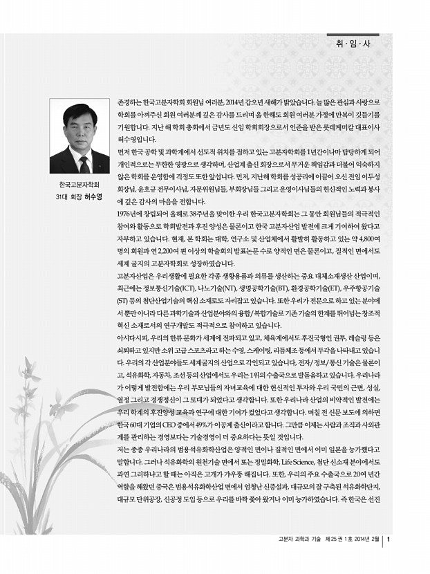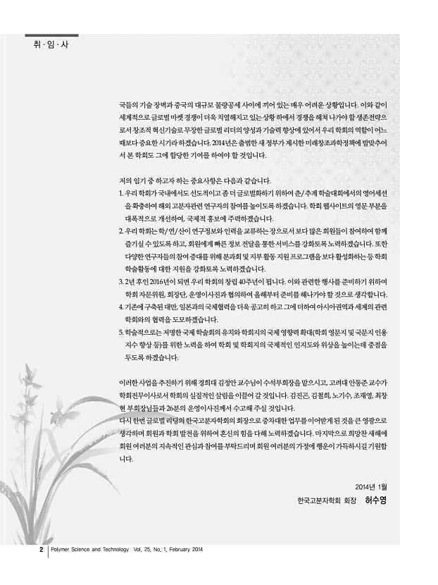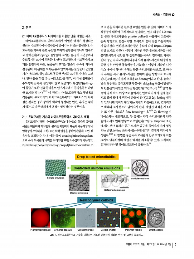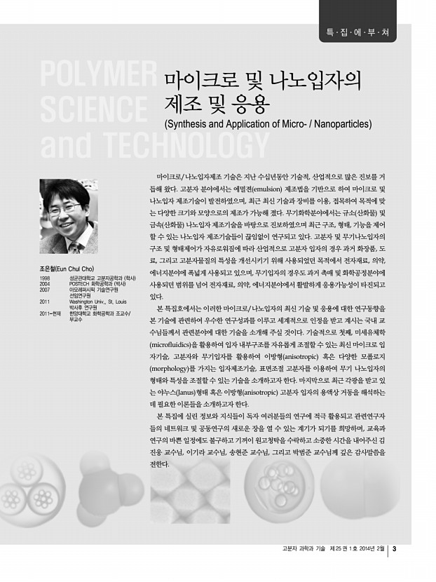 고분자 과학과 기술 제 25 권 1 호 2014년 2월 3 마이크로 및 나노입자의 제조 및 응용 Synthesis and Application of Micro- Nanoparticles 마이크로/나노입자제조 기술은 지난 수십년동안 기술적, 산업적으로 많은 진보를 거 듭해 왔다. 고분자 분야에서는 에멀젼 emulsion 제조법을 기반으로 하여 마이크로 및 나노입자 제조기술이 발전하였으며, 최근 최신 기술과 장비를 이용, 접목하여 목적에 맞 는 다양한 크기와 모양으로의 제조가 가능해 졌다. 무기화학분야에서는 규소 산화물 및 금속 산화물 나노입자 제조기술을 바탕으로 진보하였으며 최근 구조, 형태, 기능을 제어 할 수 있는 나노입자 제조기술들이 끊임없이 연구되고 있다. 고분자 및 무기나노입자의 구조 및 형태제어가 자유로워짐에 따라 산업적으로 고분자 입자의 경우 과거 화장품, 도 료, 그리고 고분자물...