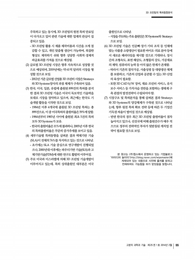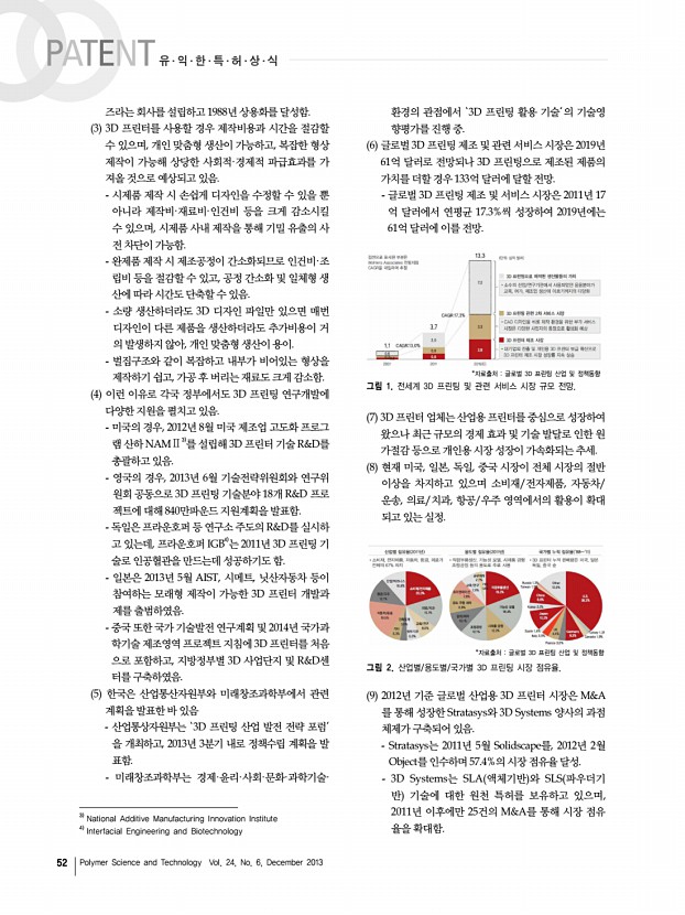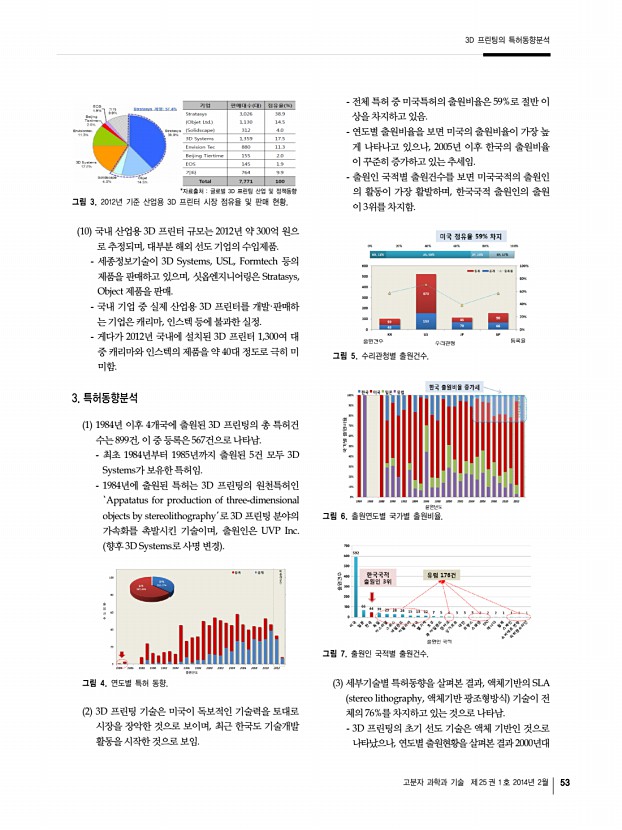 3D 프린팅의 특허동향분석 고분자 과학과 기술 제 25 권 1 호 2014년 2월 53 *자료출처 글로벌 3D 프린팅 산업 및 정책동향 그림 3. 2012년 기준 산업용 3D 프린터 시장 점유율 및 판매 현황. 10 국내 산업용 3D 프린터 규모는 2012년 약 300억 원으 로 추정되며, 대부분 해외 선도 기업의 수입제품. 세종정보기술이 3D Systems, USL, Formtech 등의 제품을 판매하고 있으며, 싯옵엔지니어링은 Stratasys, Object 제품을 판매. 국내 기업 중 실제 산업용 3D 프린터를 개발·판매하 는 기업은 캐리마, 인스텍 등에 불과한 실정. 게다가 2012년 국내에 설치된 3D 프린터 1,300여 대 중 캐리마와 인스텍의 제품을 약 40대 정도로 극히 미 미함. 3. 특허동향분석 1 1984년 이후 4개국에 출원된 3D 프린팅의 총 특허건 수는 899건, 이 중 등록은 567건으로 나타남. 최초 1984년부터 1985년까지 출원된 5건 모두...