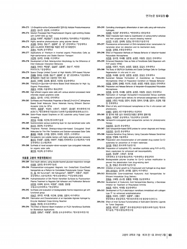 연구논문 발표일정 고분자 과학과 기술 제 25 권 1 호 2014년 2월 93 3PS-273 1,2-Dinaphthyl-ortho-Carborane에서 일어나는 Multiple Photoluminescence 조양진, 김소연, 강상욱, 고려대학교 3PS-274 Solution Processed Red Phosphorescent Organic Light-emitting Diodes with CzPAF-OXD as Host 조우섬, 이재욱*, 제갈영순**, 진성호,부산대학교; *동아대학교; **경일대학교 3PS-275 Highly sensitive photoconductor using polymer blends 조장환, 정대성, 권순기*, 김윤희*, 강 일*, 중앙대학교; *경상대학교 3PS-276 실버-나노와이어 투명전극을 적용한 유연 유기태양전지 조현수, 박상혁, 공주대학교 3PS-277 Applications of Ytterbium in Inverted organic Photovoltaic Cells as High-performance and Stable Electron Transport 지찬혁, 김규민, 오세용, 서강대학교 3PS-278 Development of Bulk Heterojunction Morphology by the Difference of Inter-molecular Interaction Behaviors 차효정, 안태규, ...
