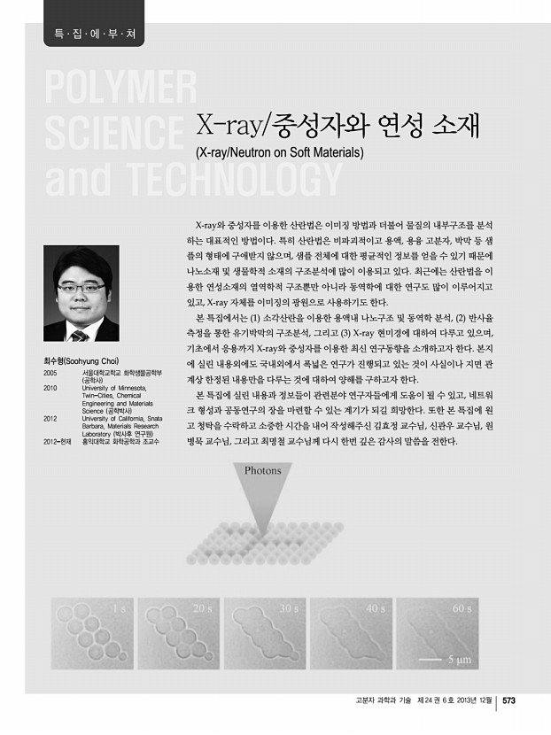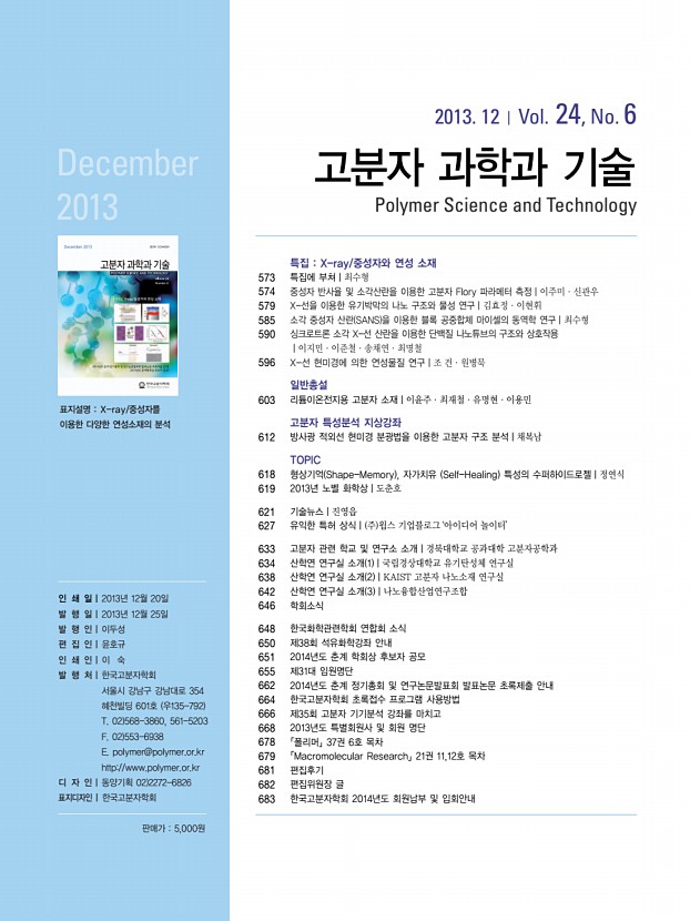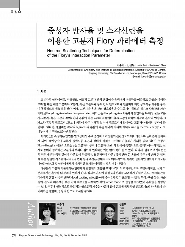 ...titute of Biological Interface, Sogang-HANANRO Center, Sogang University, 35 Baekbeom-ro, Mapo-gu, Seoul 121-742, Korea E-mailkwshin@sogang.ac.kr 이주미 2010 단국대학교 고분자공학과 학사 2012 단국대학교 고분자공학과 석사 2013-현재 서강대학교 화학과 박사과정 신관우 1995 서강대학교 화학과 학사 1997 KAIST 신소재공학과 석사 2000 SUNY Stony Brook 재료공학과 박사 2000-2002 NIST 중성자연구센터 방문연구원 2002-2006 광주과학기술원 신소재공학과 2006-현재 서강대학교 화학과 및 바이오융합과정 교수 1. 서론 고분자의 상전이현상, 상평형도, 이질적 고분자 간의 혼합이나 용액내의 거동등을 예측하고 현상을 이해하 고자 할 때는 해당 고분자와 고분자, 혹은 고분자와 용액 간의 엔트로피와 엔탈피에 의한 상호작용 계수를 통하 여 통상적으로 예측하게 된다. 이때, 고분자나 용액 간의 상호작용을 ...