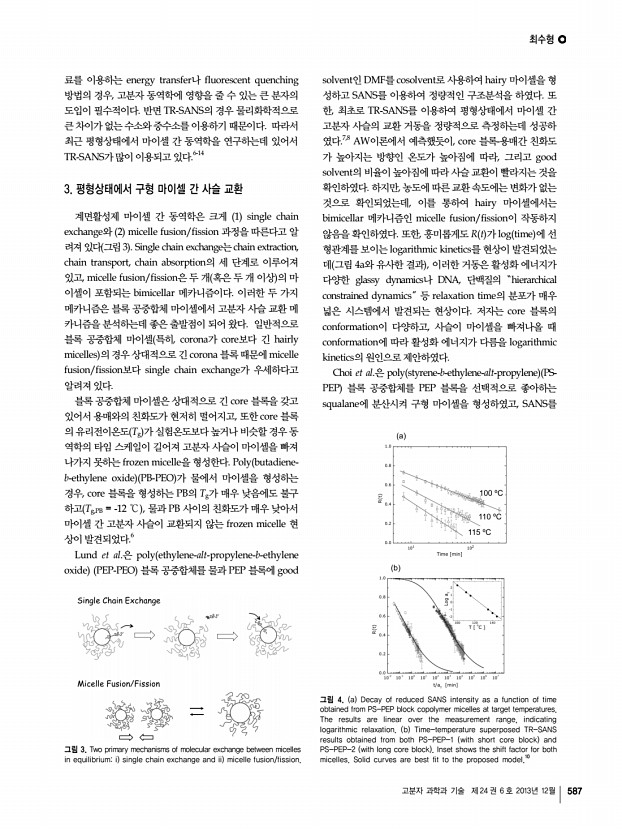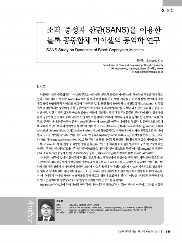 특 집 고분자 과학과 기술 제 24 권 6 호 2013년 12월 585 소각 중성자 산란 SANS 을 이용한 블록 공중합체 마이셀의 동역학 연구 SANS Study on Dynamics of Block Copolymer Micelles 최수형 | Soohyung Choi Department of Chemical Engineering, Hongik University 94 Wausan-ro, Mapo-gu, Seoul 121-791, Korea E-mailshchoi@hongik.ac.kr 최수형 2005 서울대학교 화학생물공학부 공학사 2010 University of Minnesota, Twin-Cities, Chemical Engineering and Materials Science 공학박사 2012 University of California, Santa Barbara, Materials Research Laboratory 박사후 연구원 2012-현재 홍익대학교 화학공학과 조교수 1. 서론 양친매성 블록 공중합체의 자기조립구조는 연성물질 구조와 물성을 제어하는데 핵심적인 역할을 담당하고 있다.1 특히 리피드 세포막, worm-like 마이셀 등의 복합 유체 거동, 약물 전달물질 등 여러 산업 분야에서 양친 매성 블록 공중합체...