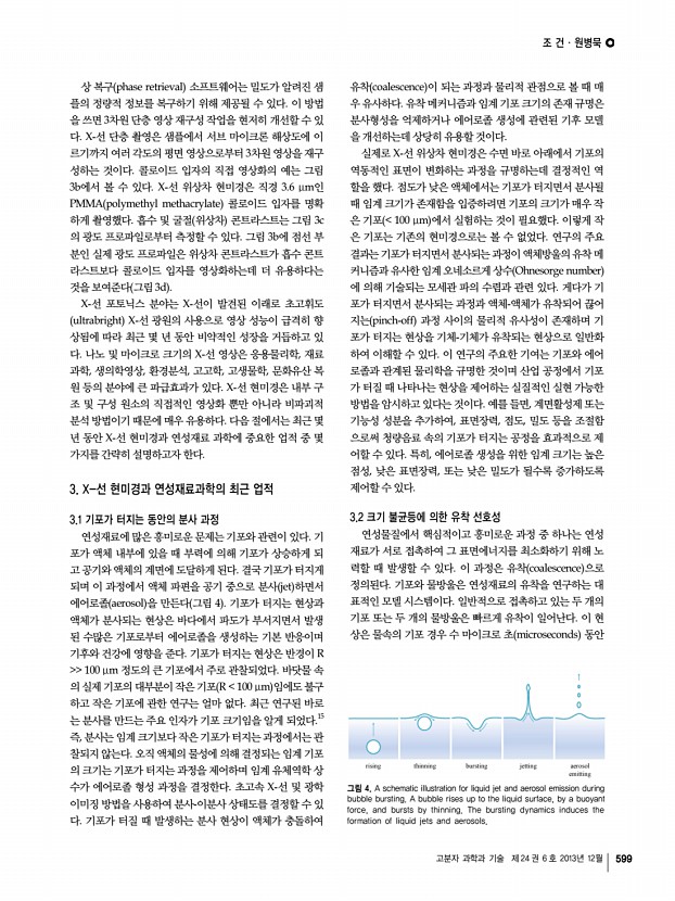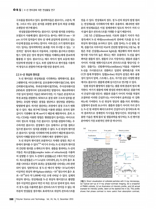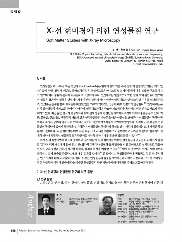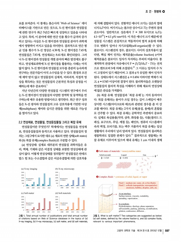 조 건ㆍ원병묵 고분자 과학과 기술 제 24 권 6 호 2013년 12월 597 그림 1. Total annual number of publications and total annual number of citations based on Web of Science database in the topics of a X-ray imaging, b X-ray microscopy, c soft matter, and d soft materials. 그림 2. What is soft matter? Two categories are suggested as belowa soft states, defined by the volume fraction φ, and b complex fluids, relevant to various important phenomena. 요를 보여준다. 이 통계는 톰슨사의 ‘Web of Science’ 데이 터베이스를 기반으로 만든 것으로, X-선 현미경과 연성물질 에 관한 연구가 최근 5년간 빠르게 성장하고 있음을 나타내 고 있다. 특히, 이 분야에 대한 연간 인용 횟수가 급격히 증가 하고 있다는 사실은 X-선 현미경과 연성물질 분야가 과학계 에서 영향력이 커지고 있음을 의미한다. 결과적으로 연간 평 균 인용 횟수가 X-선 영상은 4.38개, X-선 ...
