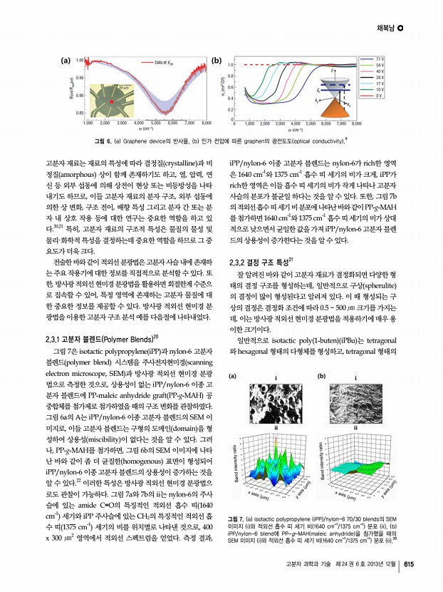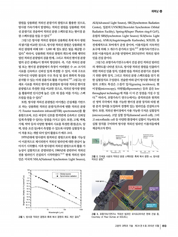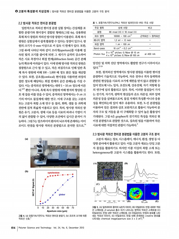...미경을 사용하면 파장의 절반 정도에 해당하는 회절 한계의 공간 분해능을 가질 수 있다. 이는 중적외선 영역에서는 대략 1 10 ㎛ 정도에 이른 다.4,15 뿐만 아니라, 흑체 복사 광원에 비해 현저히 향상된 신 호 대 잡음 비를 얻을 수 있어, 중적외선 영역에서는 수 ㎛ 크 기의 바이오 물질계에 대한 연구, 미세 구조를 갖는 고분자 또는 고분자 복합 소재 연구 등 물리, 화학, 생물 등 과학계 전반에 걸쳐 폭넓게 이용되고 있다. 특히, 방사광 적외선 광 원은 유기, 고분자, 생체 시료 등을 시료의 파괴나 가열이 거 의 없이 관찰할 수 있어, 다양한 조건에서 실시간 분석이 가 능하다. 그림 5는 알츠하이머 환자의 뇌조직에 존재하는 아미 로이드 반점을 방사광 적외선 분광법으로 분석한 것으로,16 암진단 및 의학 진단 영역에서도 활발한 연구가 이루어지고 있다.17...