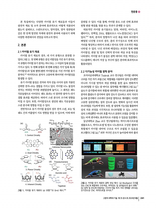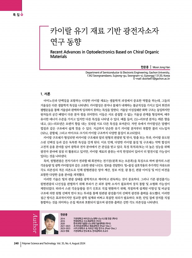...각도 의존성을 나타낸다. 카이랄 유기 재료 기반 광전자소자 연구 동향 Recent Advances in Optoelectronics Based on Chiral Organic Materials 한문종 | Moon Jong Han Department of Semiconductor & Electronic Engineering, Gachon University, 1342 Seongnamdaero, Sujeong-gu, Seongnam-si, Gyeonggi 13120, Korea E-maildoorbell1@gachon.ac.kr 한문종 2014 가천대학교 바이오나노대학 나노시스템 전공 학사 2016 연세대학교 신소재공학과 석사 2020 한국과학기술원 나노과학기술대학원 박사 2021-2023 조지아공과대학교 재료공학과 Post-Doc. 2023-2023 시카고대학교 & 아르곤 국립 연구소 Post-Doc. 2023-현재 가천대학교 반도체 & 전자공학과조교수